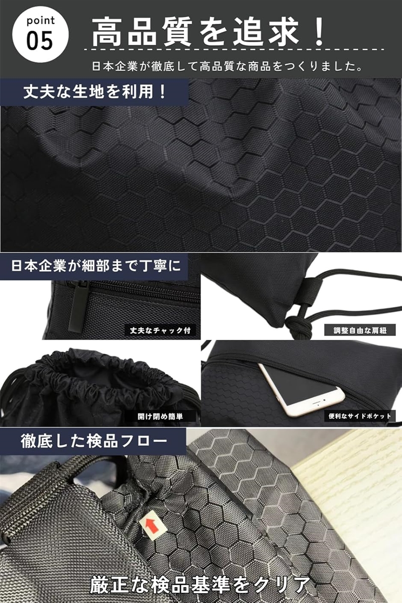 このナップサックは、軽量でありながら頑丈な素材を使用しており、大量の荷物を楽々収納できます。