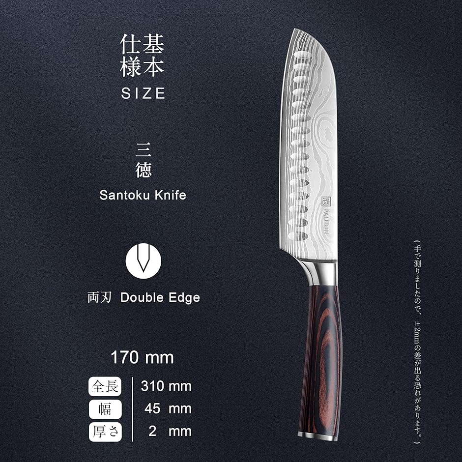 | 商品名 | 三徳包丁 170mm シェフナイフ 両刃 左利き対応 鞘付き 高炭素ステンレス 切れ味長い 木製ハンドル 肉切り・ 魚切り・菜切り包丁 キッチンナイフ |