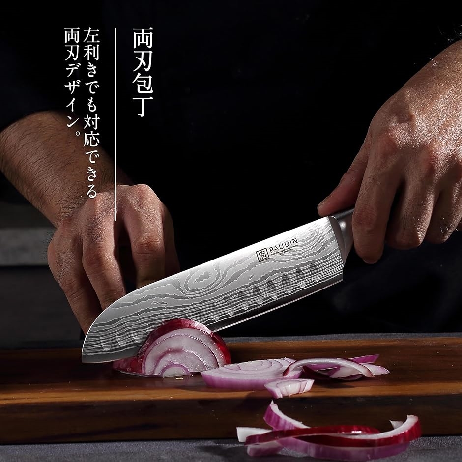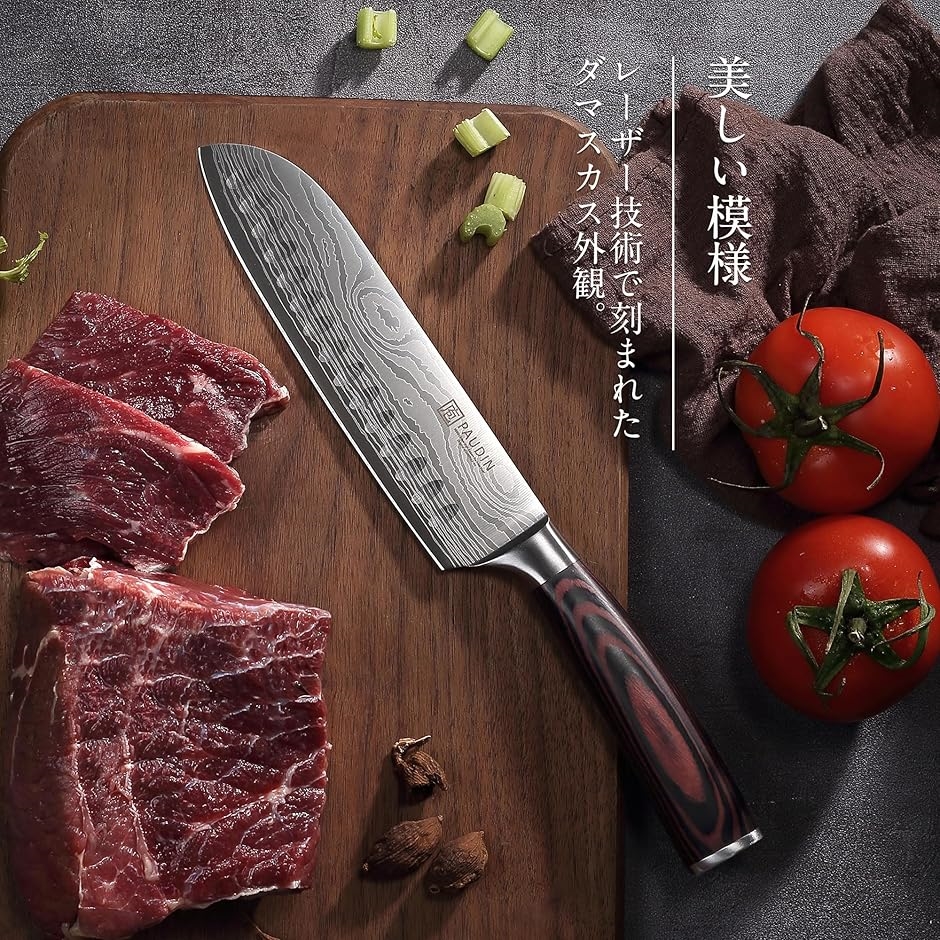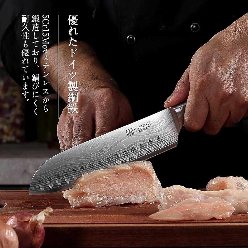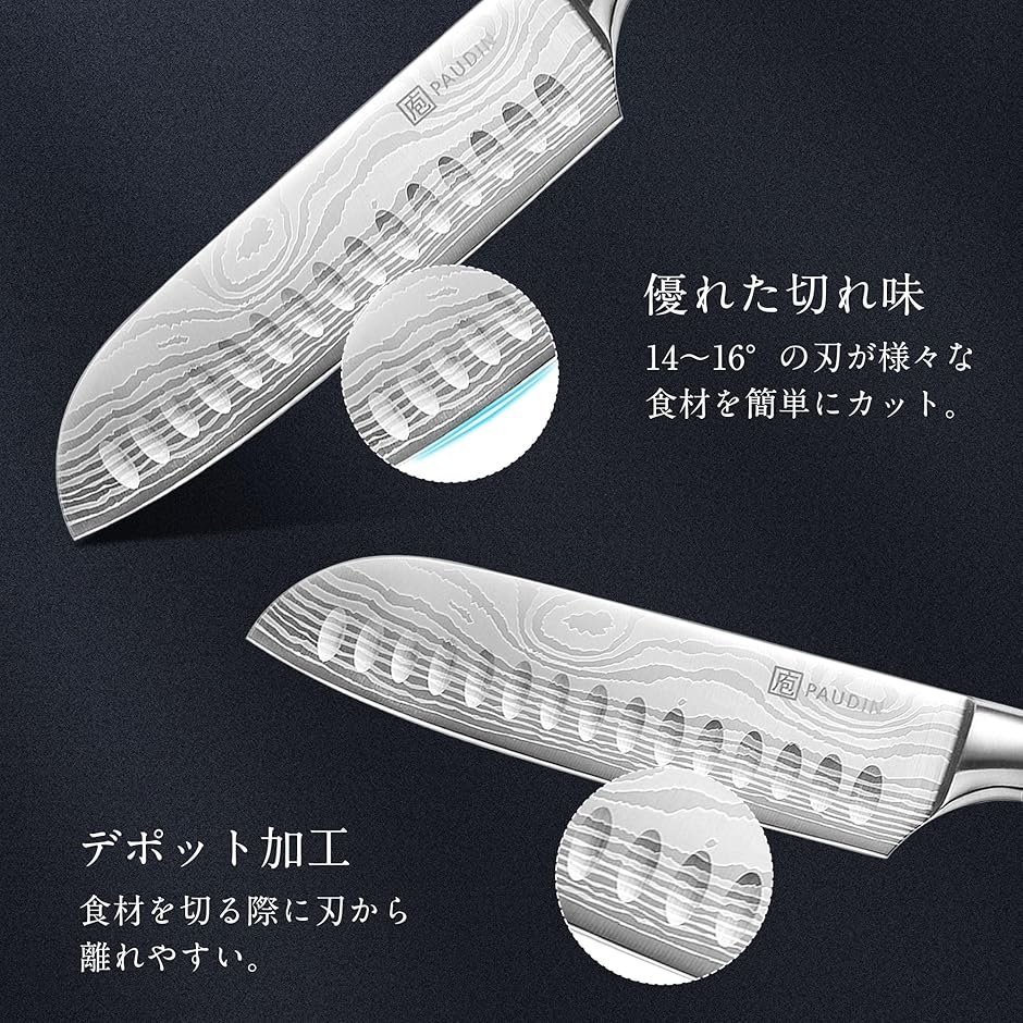 「高炭素ステンレス高級包丁」 パウディンの包丁は、5Cr15Movの高炭素ステンレス鋼が使用された三徳ナイフ。