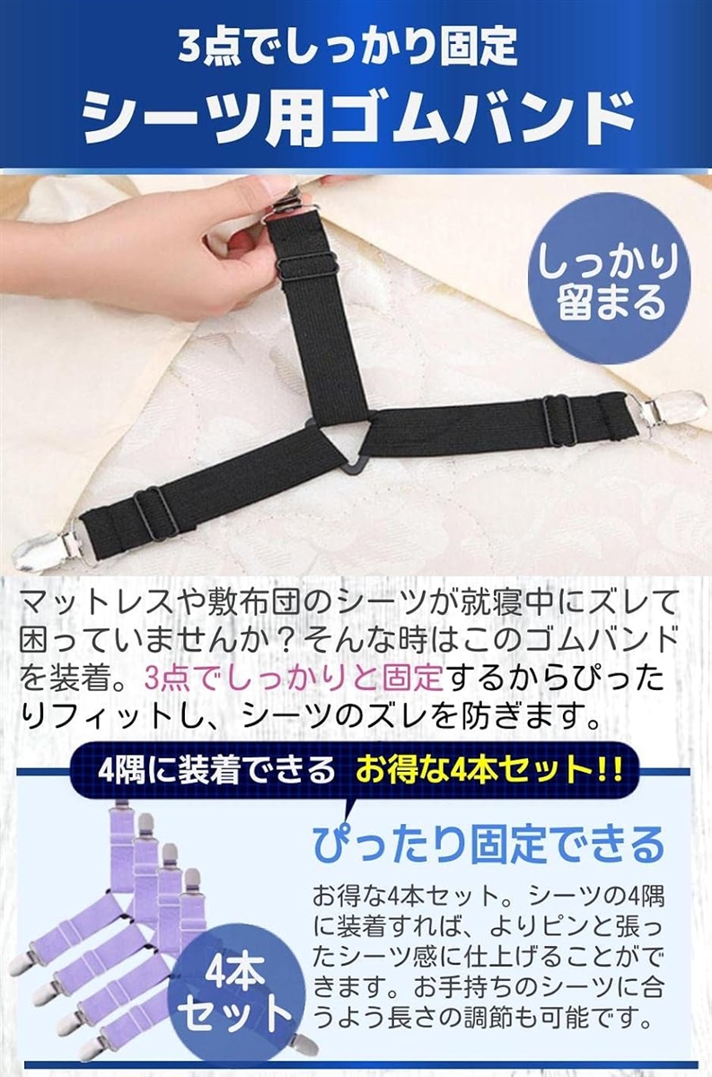 | 商品名 | 布団 シーツ ズレ防止 3点固定 クリップ ゴム バンド 三角形 コーナー 4本セット |