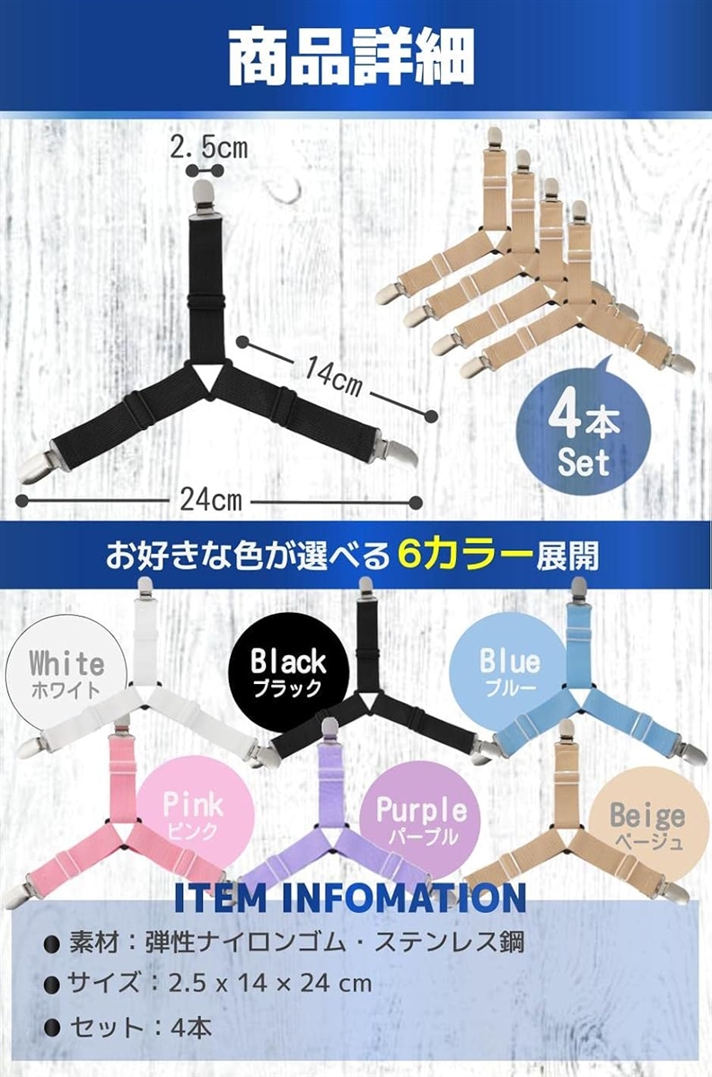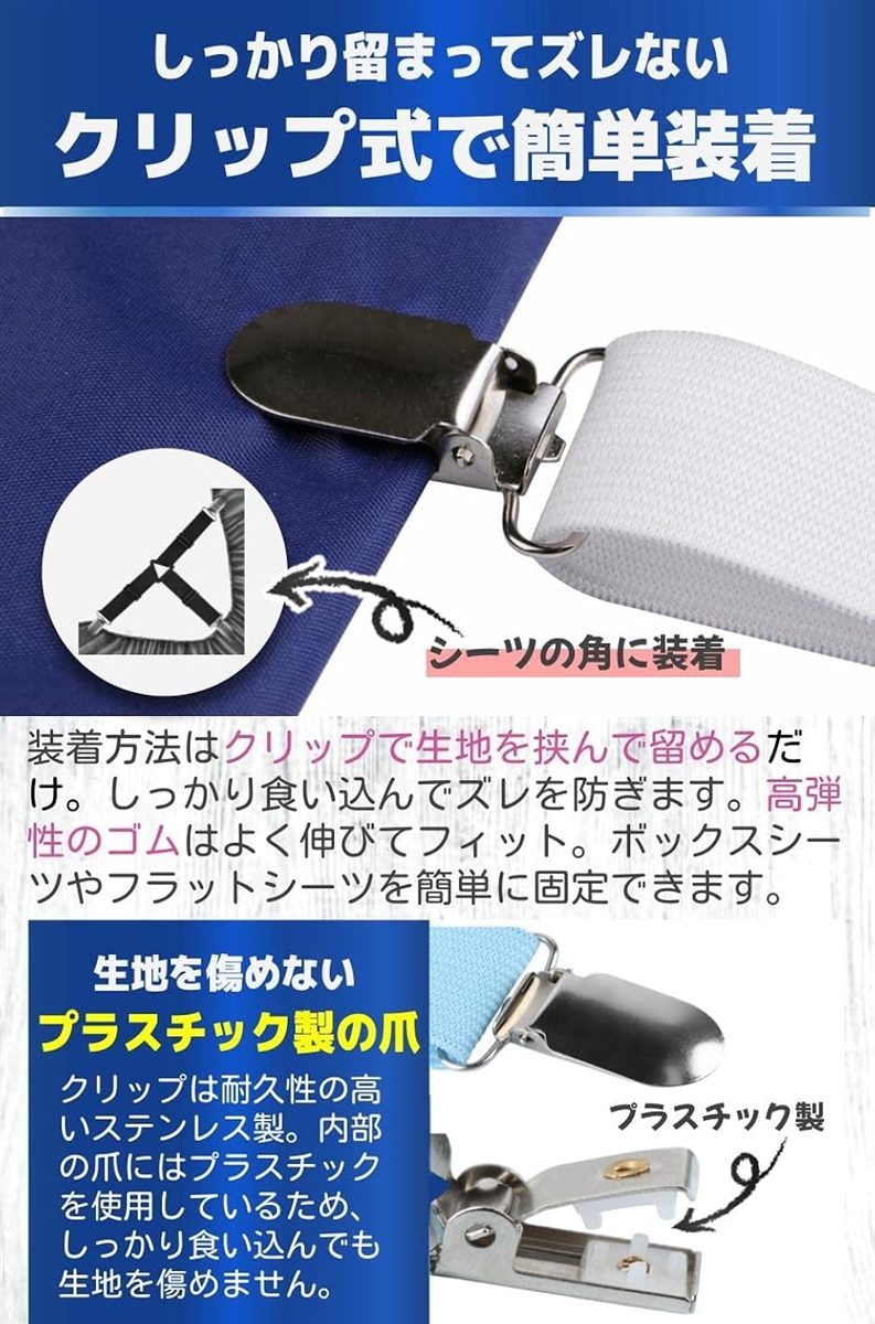 「商品特徴」 しっかり留まる:プラスチック製の爪が生地を傷めずしっかりホールド ズレにくい3点固定:シーツの角にぴったりフィットする3点固定式 お得な4本セット:シーツの4隅に使える4本セット 豊富なカラー展開:6色から好きな色を選べる