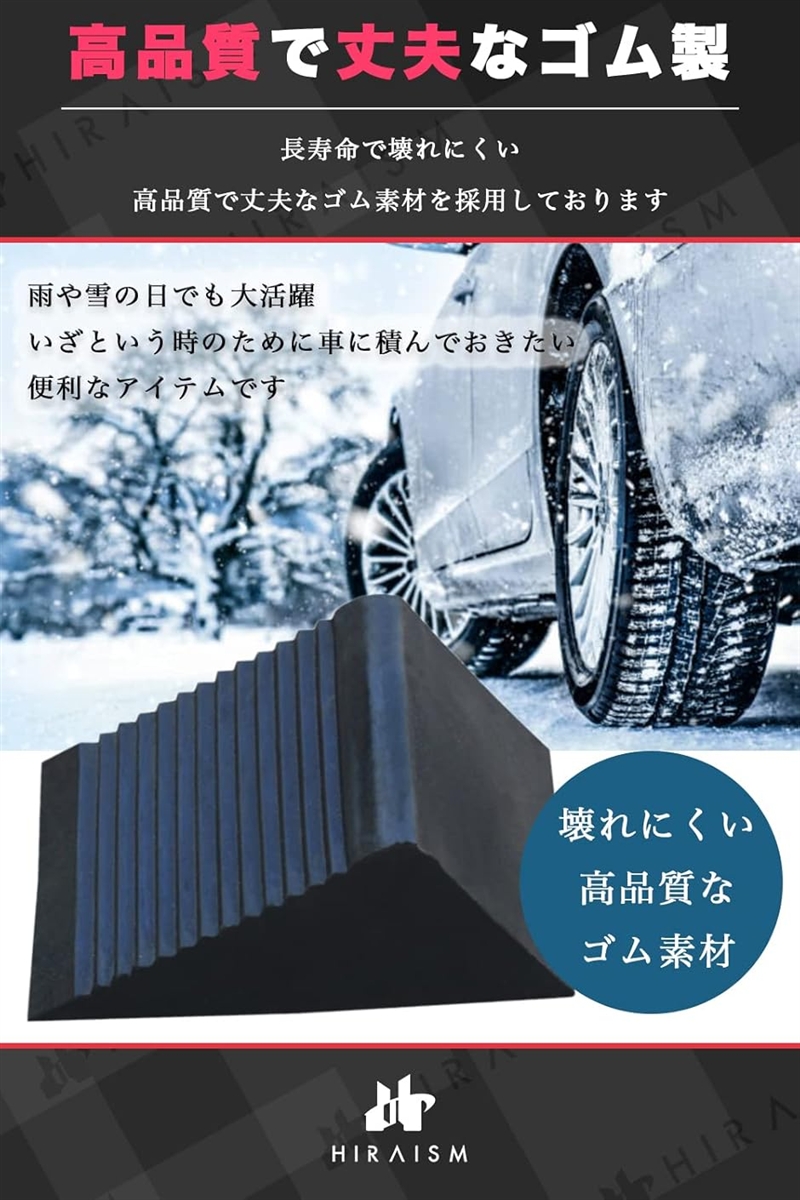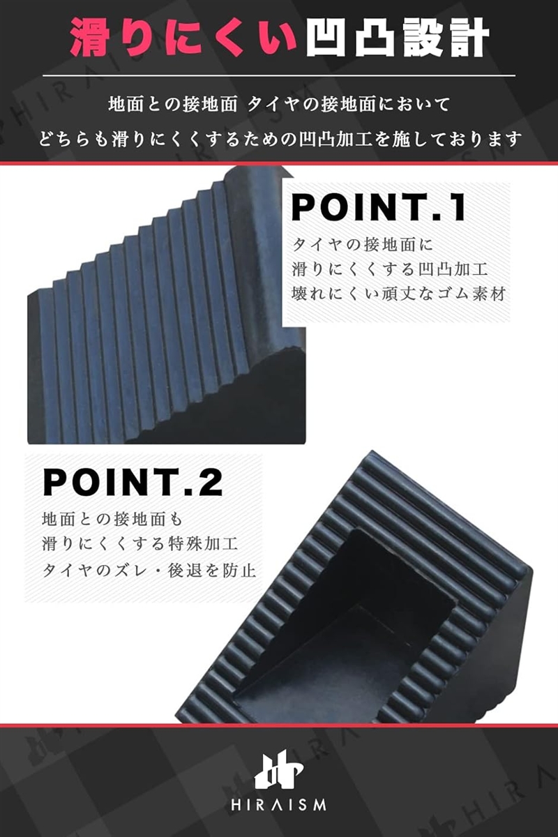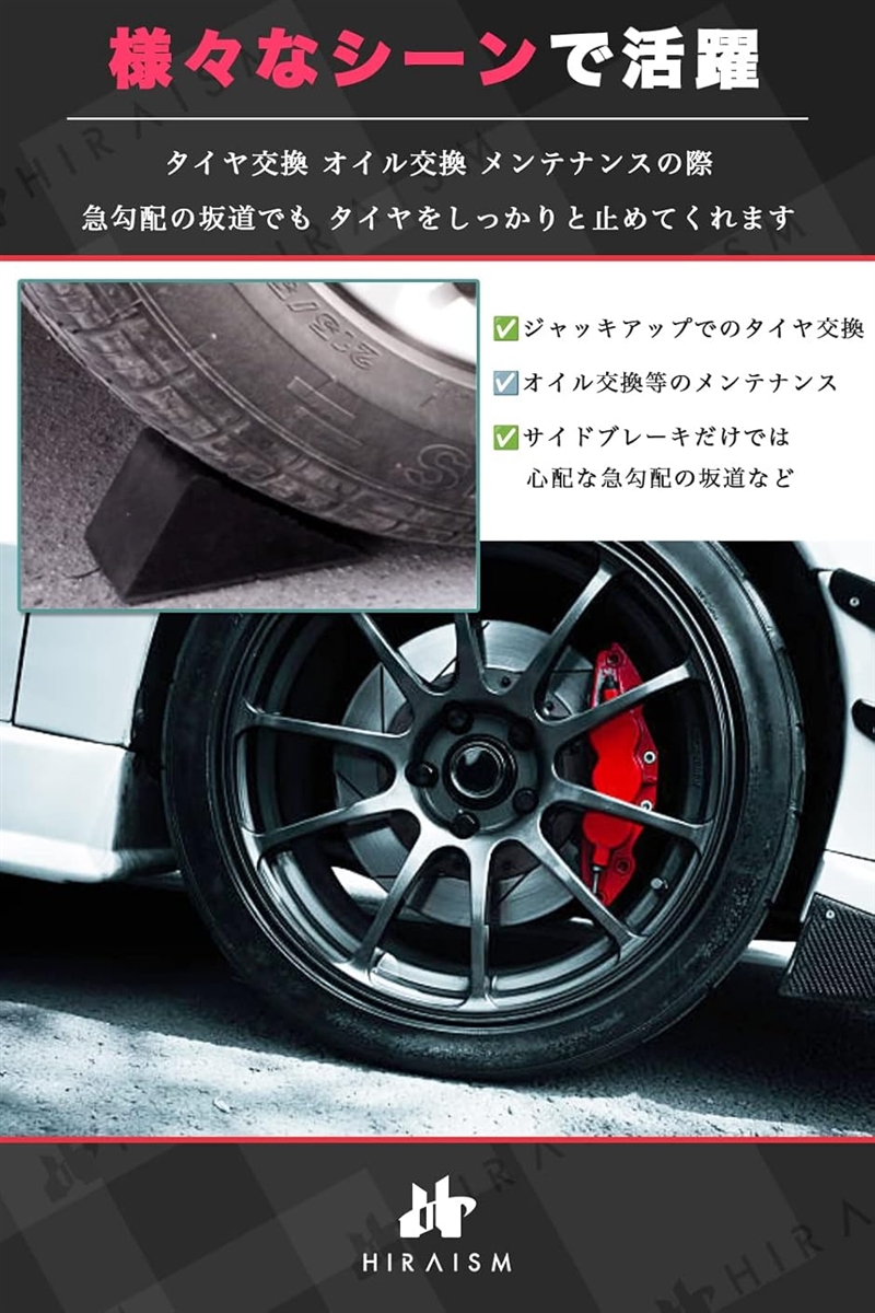 ジャッキアップでのタイヤ交換、オイル交換等のメンテナンス、サイドブレーキだけでは心配な急勾配の坂道でも、タイヤをしっかりと止めてくれます。