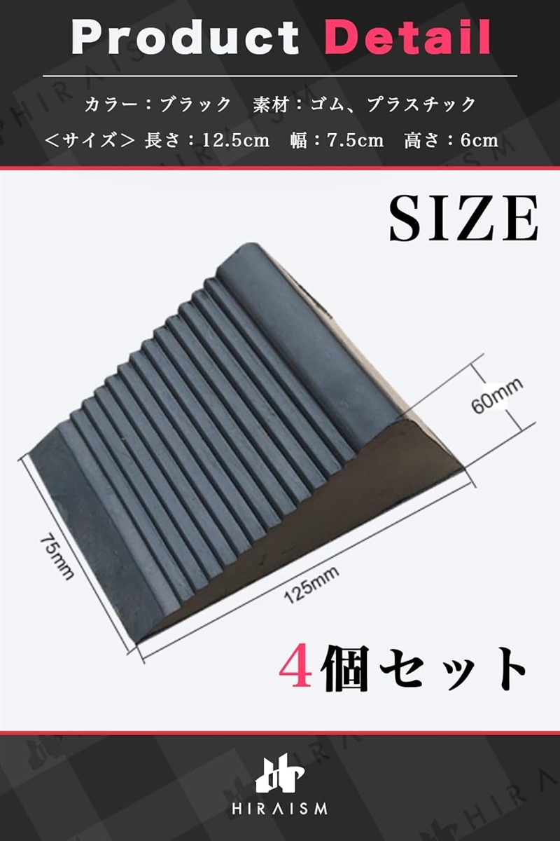 「商品内容」タイヤストッパー:4個 カラー:ブラック <サイズ> 長さ:12.5cm 幅:7.5cm 高さ:6cm 素材:ゴム、プラスチック *工場の生産及び製品の都合上、小さな傷等がある場合がございますが、新品となります。