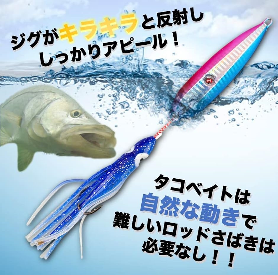 タコベイト部分とオモリ部分が分かれているため、フォール中はオモリ部分がキラキラと光を反射し、タコベイト部分が揺れて複雑な動きをします。フォール中はオモリ部分がキラキラと光を反射し、タコベイト部分が水流によって自発的に自然なアピールをしてくれるため、ジギングのようなロッドを使ったアクションをしなくても良く、誰でも扱いしやすいです。