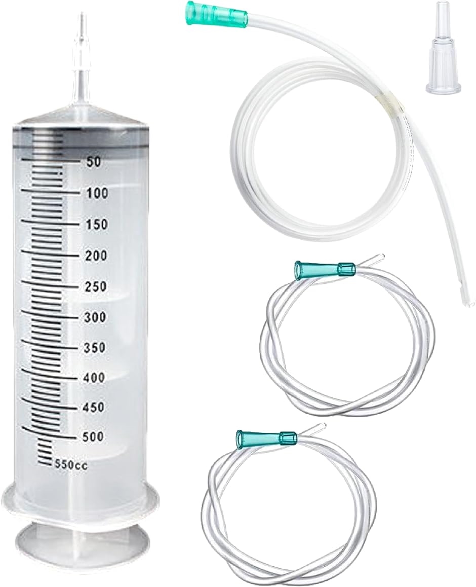 大容量550mlのシリンジ、100cmのカテーテル3本付きです。