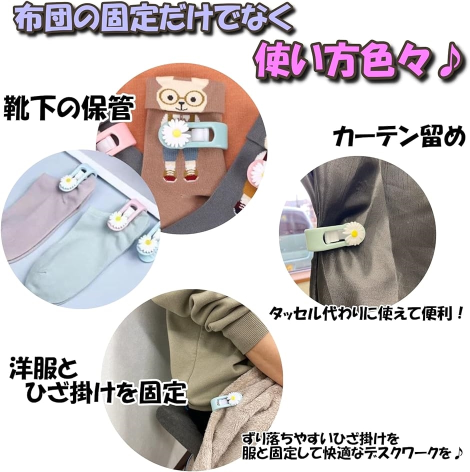 ・布団に使用できるだけではなく、洋服とひざ掛け毛布を固定する事もでき、冬のデスクワークが快適に*カーテンの固定や靴下の保管にも使用できます*「カラー」ピンク、水色「サイズ」縦:6cm、横:2.2cm、厚さ:2.6cm「商標登録番号:第6500459号」