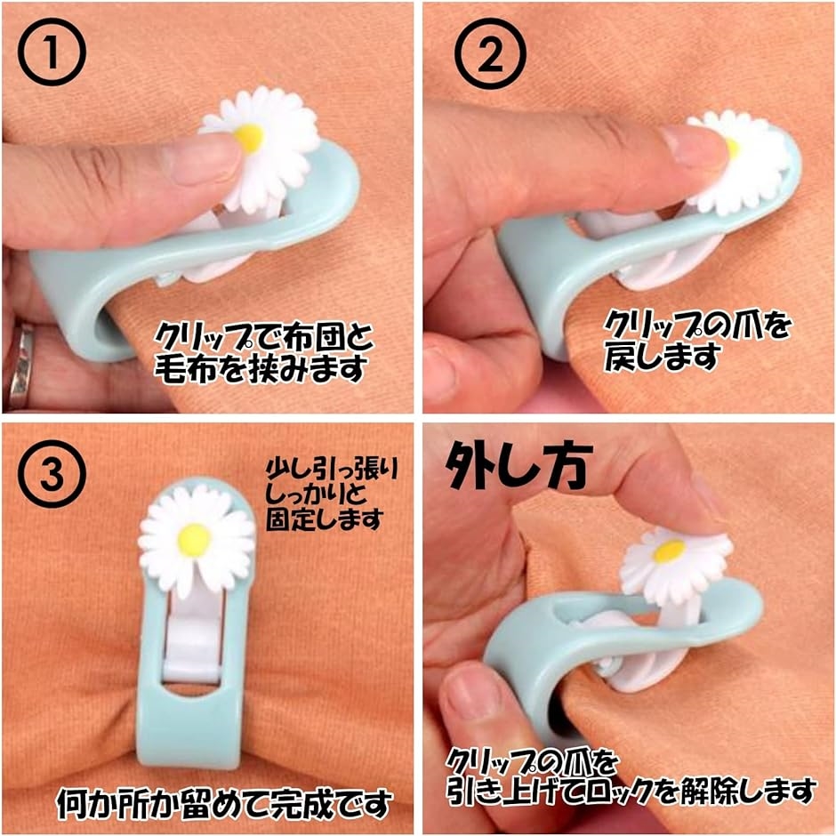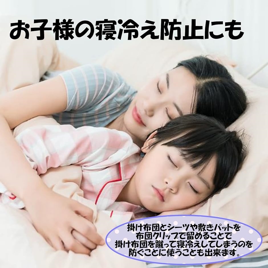 就寝中に毛布と掛布団がズレて寒さで目が覚める事がありませんか?こちらの布団クリップは毛布と掛布団を挟んで止める事で、就寝中にズレてしまうのを防ぎます。