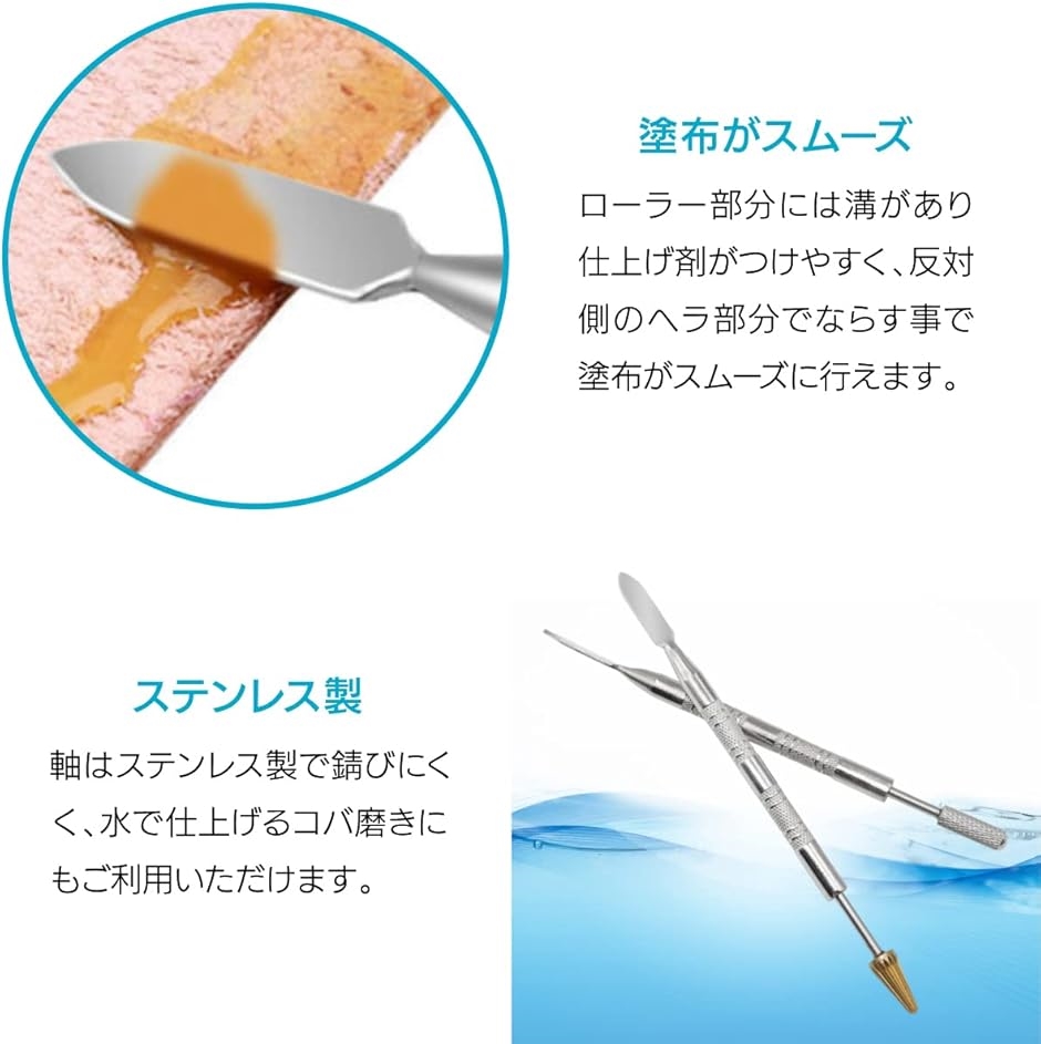 ローラー部分には溝があり処理剤・仕上げ剤がつけやすく、ローラーで適量をつけた後、反対側のヘラ部分でならす事で塗布がスムーズに行えます。