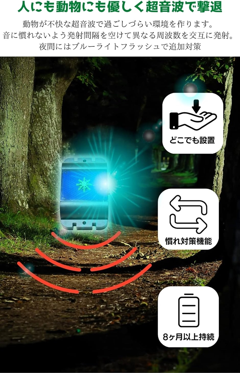 野生動物の好まない超音波や、自然界にほとんどない青色の光で野生動物が近づかないような場所においておくことで、野生動物を遠ざけるようにします。