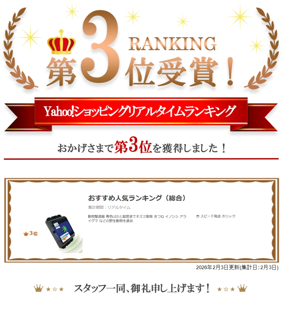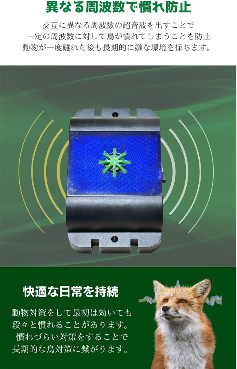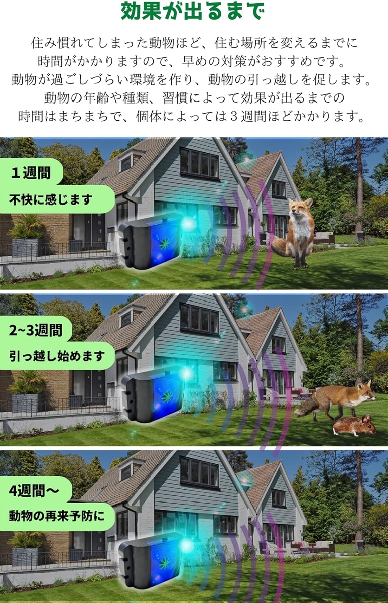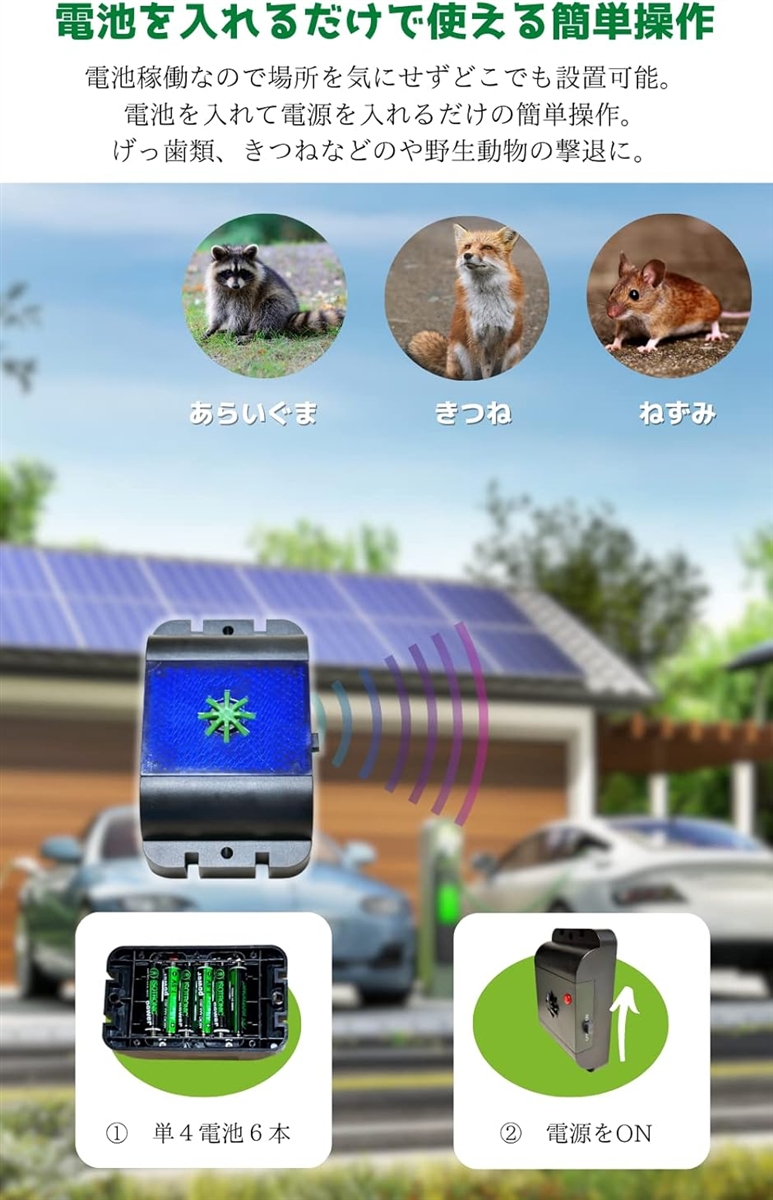 | 商品名 | 動物撃退器 青色LEDと超音波でネズミ駆除 きつね イノシシ アライグマ などの野生動物を退治 |