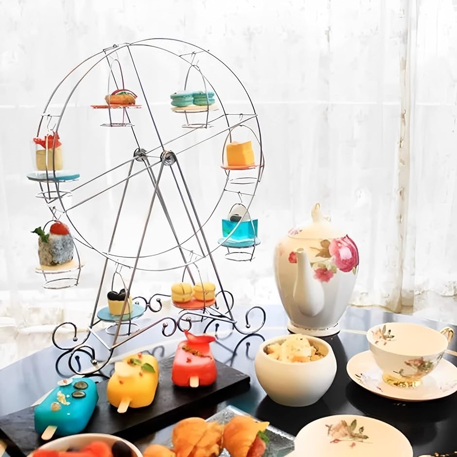 ただお皿やテーブルに並べるよりも、観覧車型のディスプレイを使えば、より立体的で華やかな雰囲気になります。