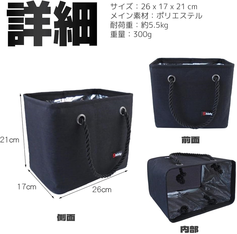 「詳細」サイズ:26 x 17 x 21 cm メイン素材:ポリエステル 耐荷重:約5.5kg 重量:300g