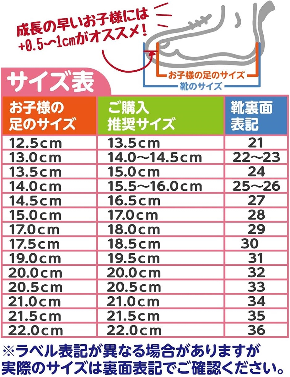 成長の早いお子様用に1サイズ大き目がおすすめです。