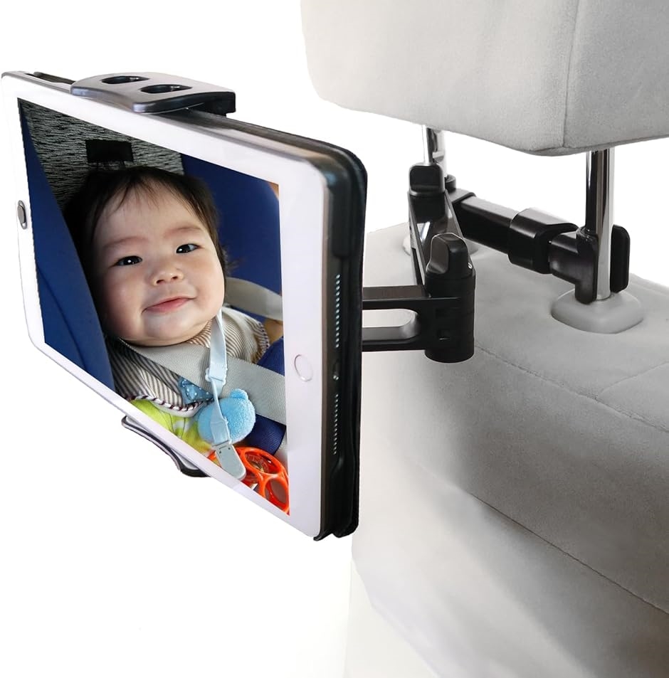 タブレットホルダー を ヘッドレストへ装着。アームの長さが調節できるので赤ちゃんやお子さまが見やすい位置へ設置できる。。簡単取付 工具不要