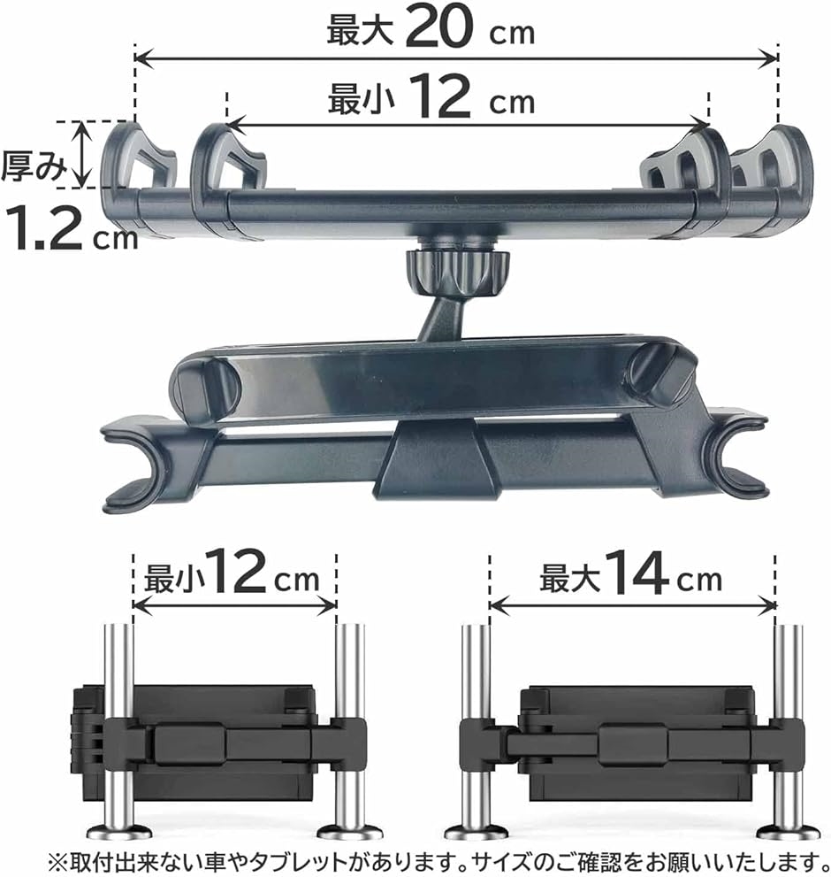 車載ホルダー 幅12cm〜20cm 厚み1.2cm のタブレット スマホに対応。 iPad Kindle Nintendo Switch Galaxy Tab Google Nexusn iPhone Android等対応 *インチ数により取付出来ない物もあるので、上記のサイズを確認してください。