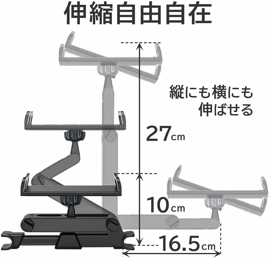 伸縮 アーム 縦10cm〜27cm 横16.5cmまで伸びるので、後部座席のどちらからでも見やすい設計。お子様1人でも2人でも3人でも見やすいです。