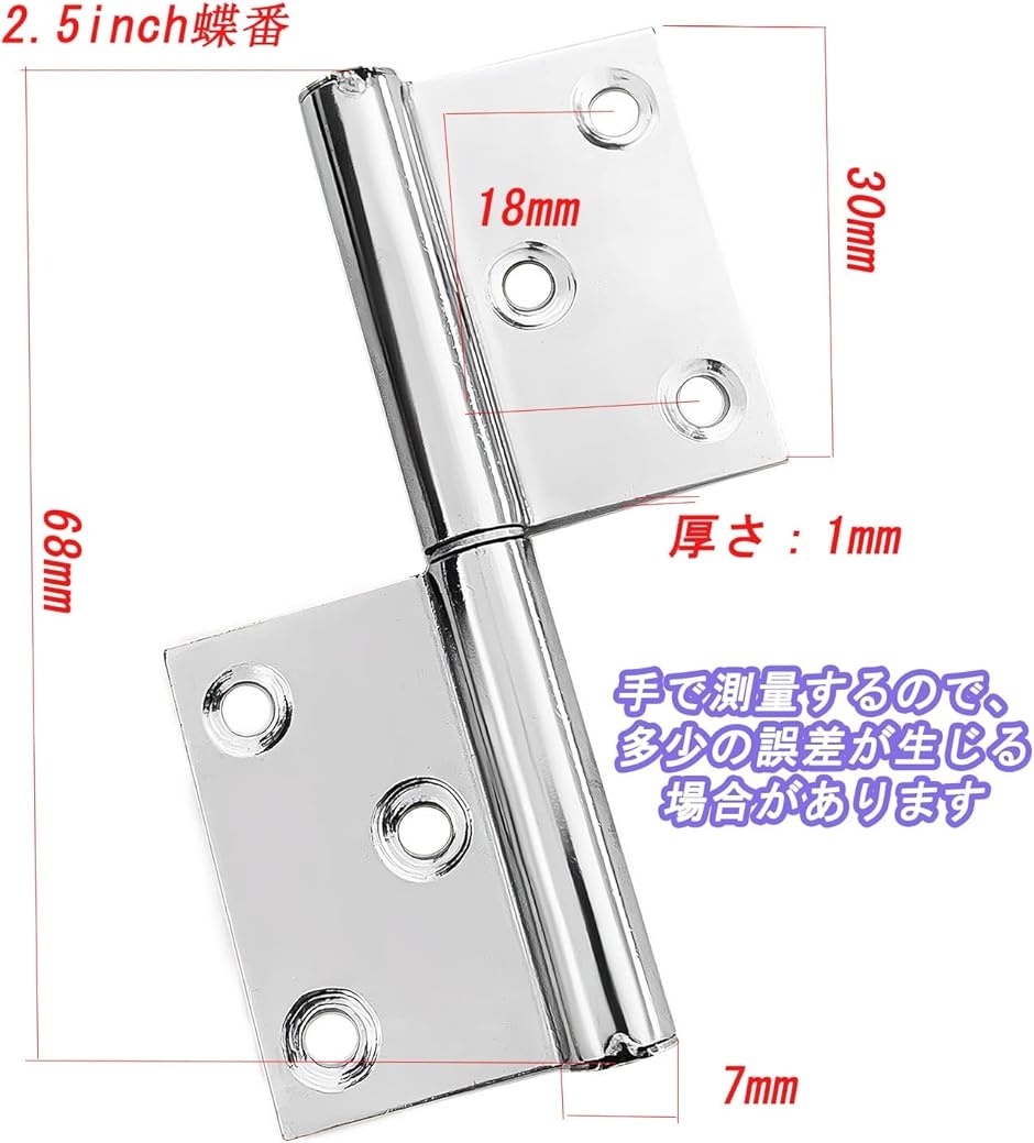 取り外し可能な旗蝶番 (2.5インチ厚さ1mm): 2.5インチの厚さがあり、1mmの耐久性を持つ取り外し可能な旗蝶番は、しっかりとしたサポートを提供します。