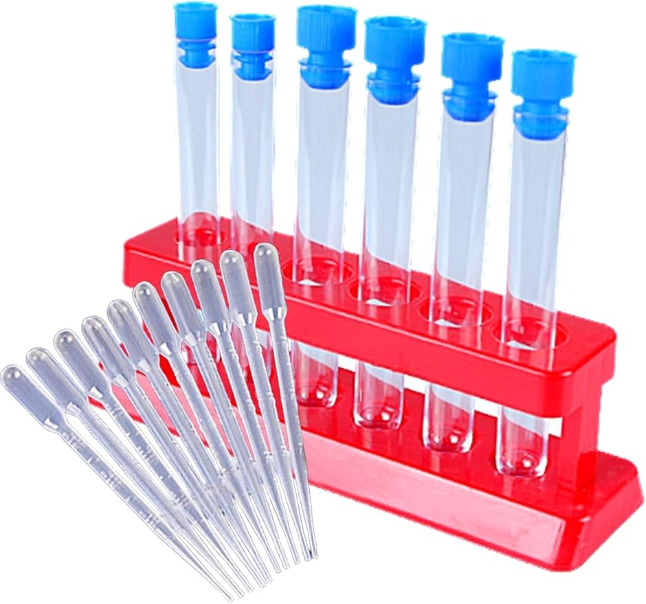 ・「プラ試験管&スポイトセット」 プラスチック試験管6本・スポイト10本・試験管たて1個のセットです。