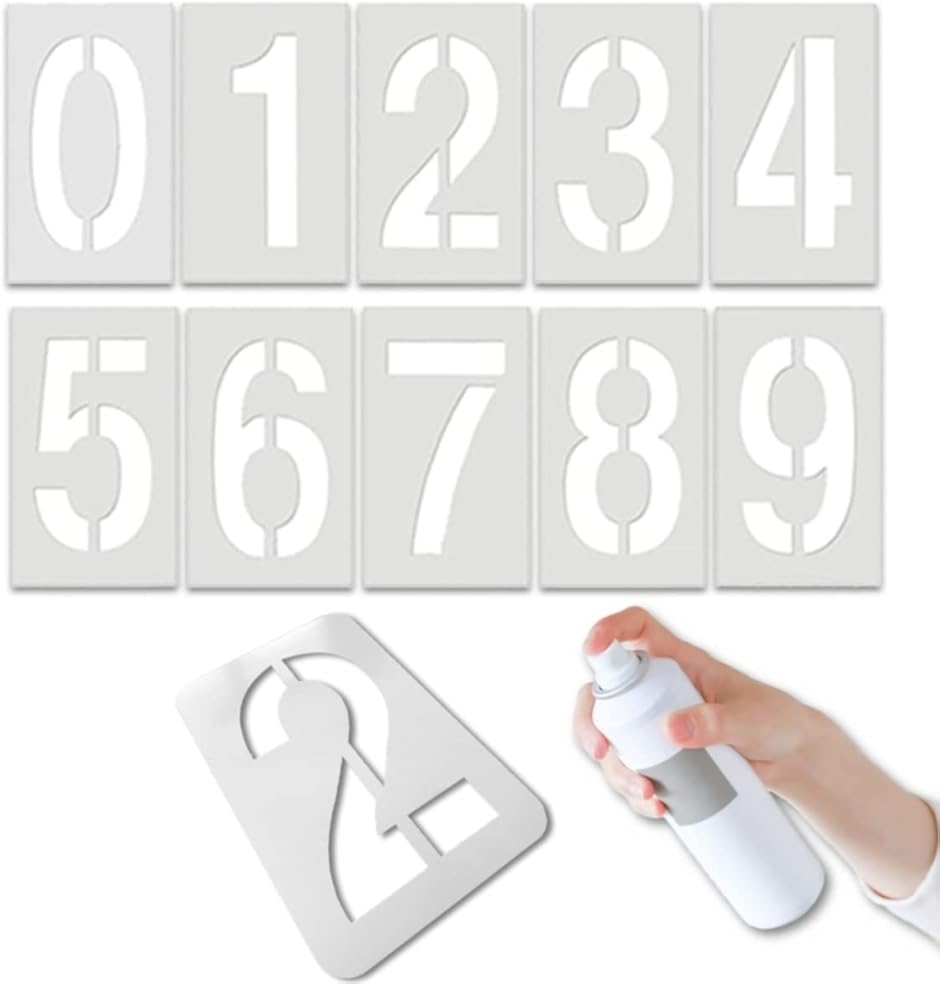 駐車場などのアスファルトやコンクリートの地面、看板などの番号を塗装する際に使用するステンシルシートのセット。駐車場や家のパーキングの管理をされていてナンバーが消えかかってお困りの方に打ってつけ。