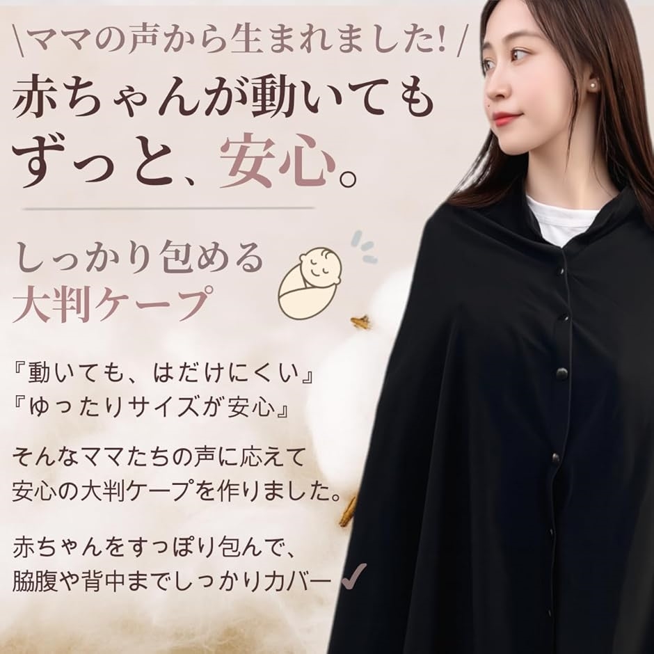 「360度安心大判ケープ」 おっぱいをあげたいけど周りに見えないか心配… 隠したいのはおっぱいだけじゃない。というママの声にお応えして、saarawordの授乳ケープはママの身体を360度しっかりカバーできる大判サイズです。