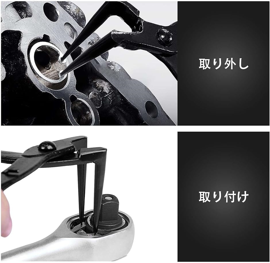 用途:深穴部のスナップリングの脱着に最適な形状で、ブレーキキャリパーやバイクのフロントフォークの分解・組立に便利です。