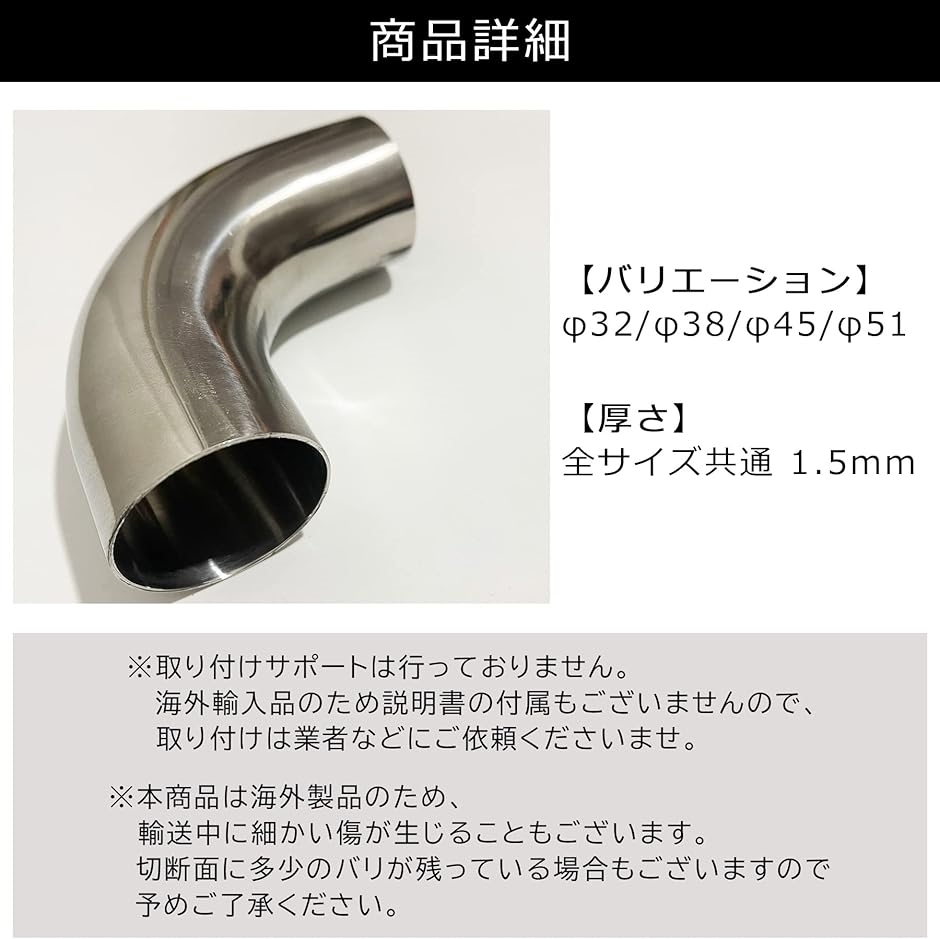 | 商品名 | 互換品 ステンレス 曲げ パイプ 90度 マフラー エキゾースト 排気管 汎用 ジョイント ワンオフ 加工 直角 SUS 304 1.5mm 厚 |