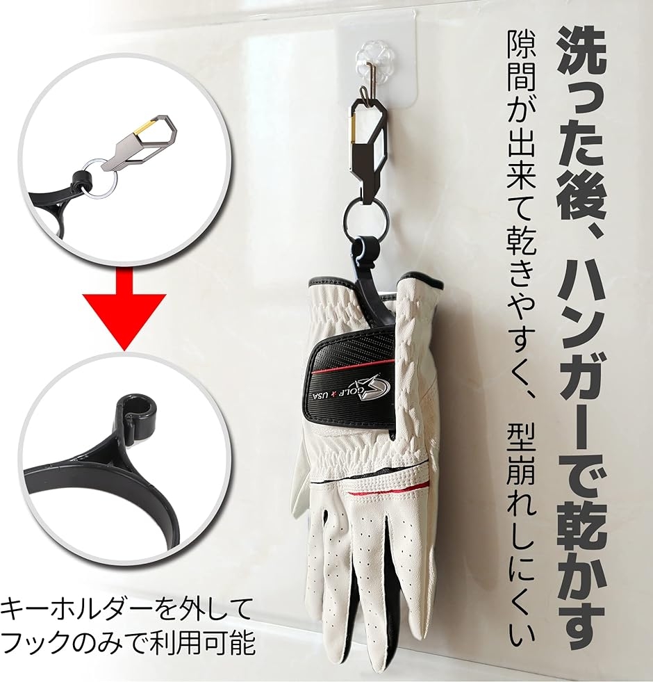 ゴルフグローブハンガーをラウンドや練習時に持参し、手の形をした本体にグローブを被せて休憩時間などに干しておけば指先まで開いて通気性を保てるので、乾かしながら雑菌などの繁殖も抑えて気持ち良く使えます。