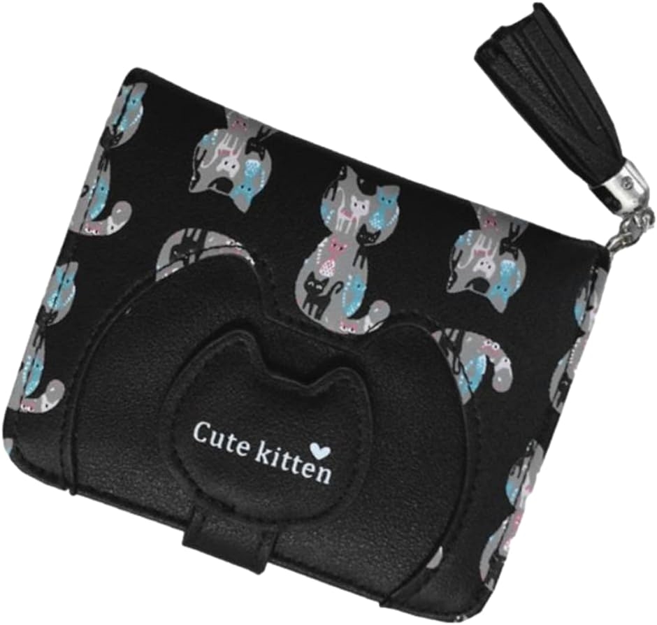 | 商品名 | 2つ折り 財布 おさいふ 猫 ねこ PUレザー 合皮 スナップ 留め ファスナー開閉 タッセル ブラック |