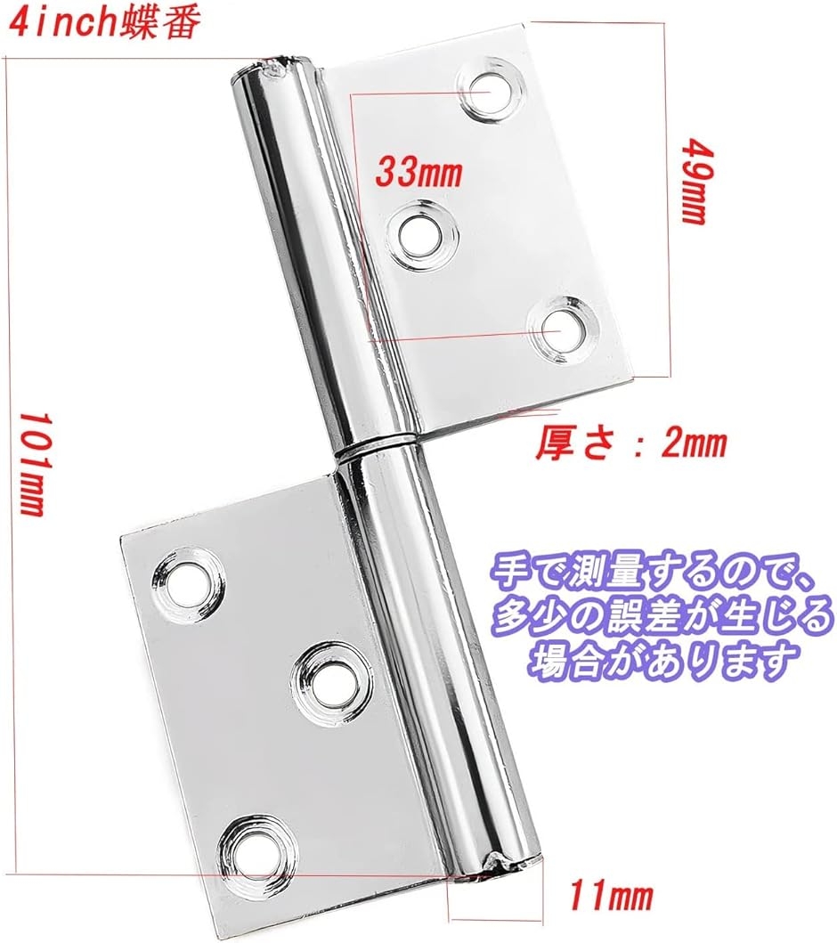 | 商品名 | 堅塁金物 ステンレス製抜き差し蝶番 リフトオフヒンジ 8個入 取り外し可能な旗蝶番 4inch厚さ2mm8個入 |