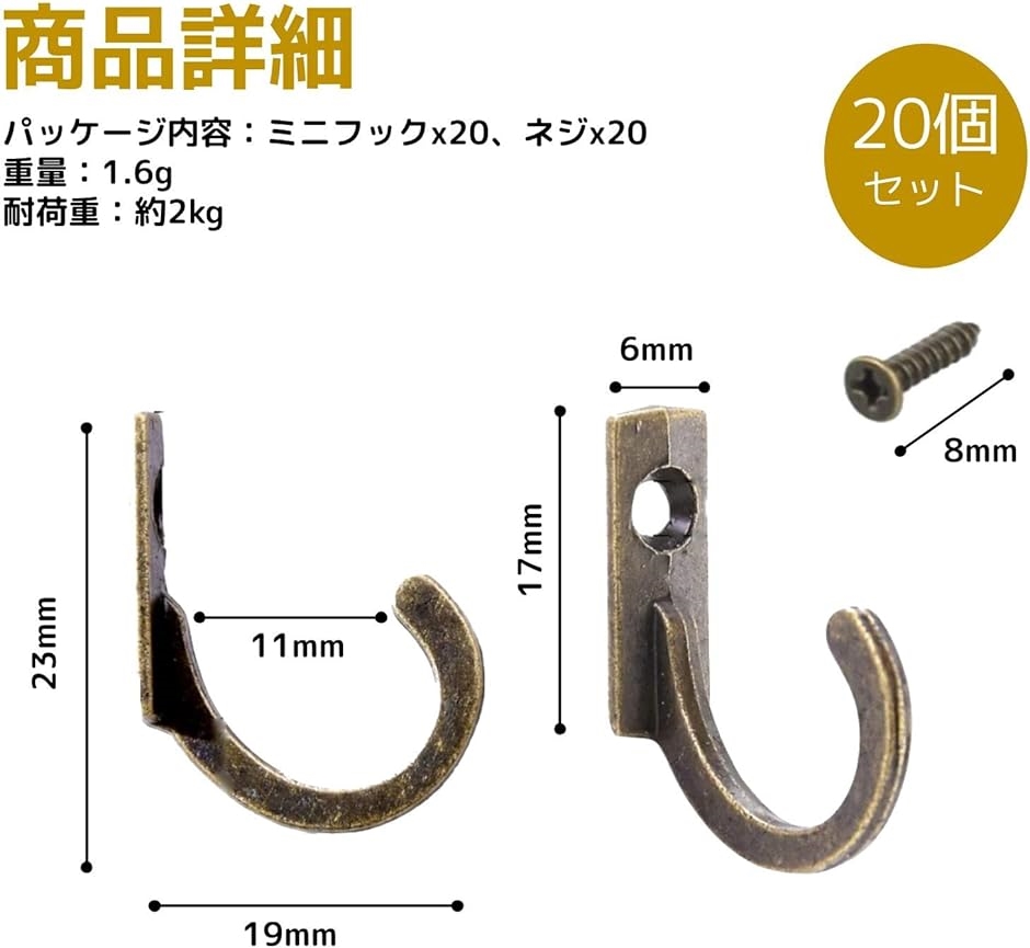 「商品詳細」セット内容:ミニフックx20、ネジx20、重量:1.6g、耐荷重:約2kg