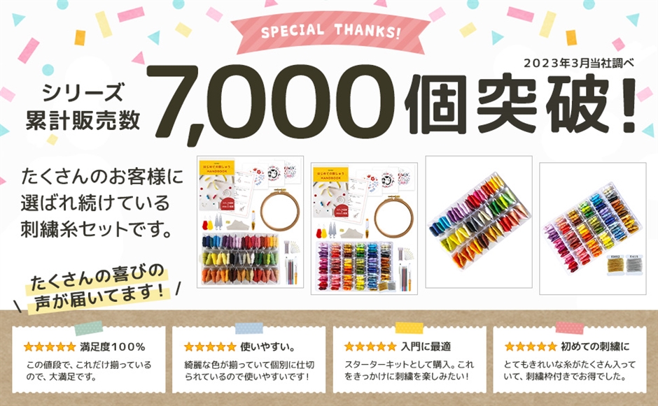 「初心者にやさしい刺繍糸セット」「これから刺繍を始めてみたいけど、糸や道具を揃えるのが面倒…」という方向けの刺繍糸と刺繍道具のセットです。