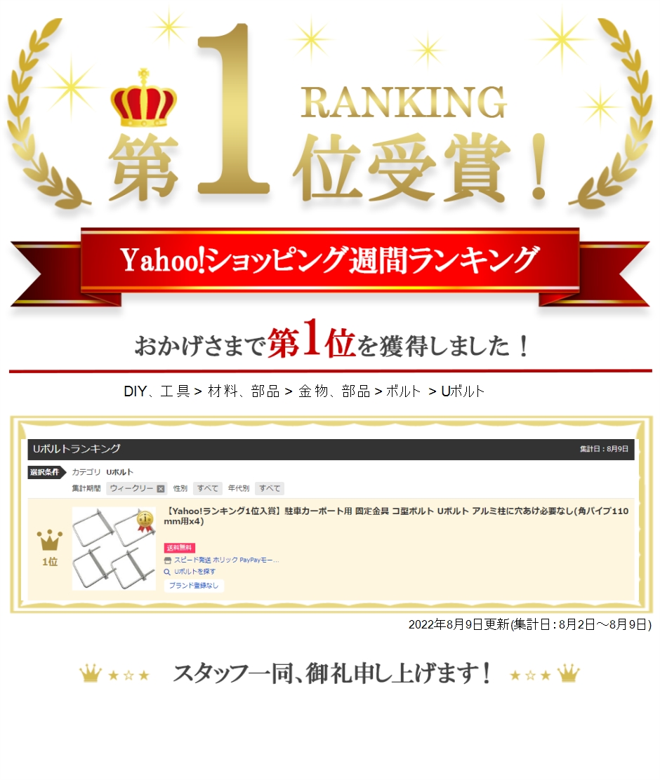 | 商品名 | 駐車カーポート用 固定金具 コ型ボルト Uボルト アルミ柱に穴あけ必要なし 締付固定 固定ベース ステンレス製 4個セット 角パイプ110mm用x4 |