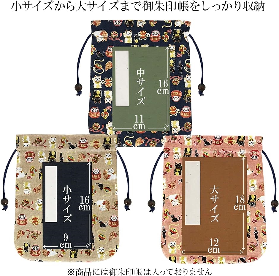・「ゆとりのある巾着で御朱印帳を収納」小サイズから大サイズまで、ご朱印帳が入る収容力のある巾着袋です。