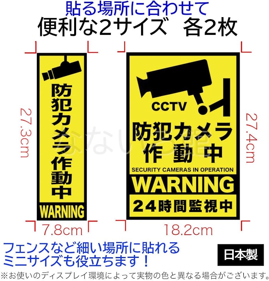 「(なないろ館)屋外用大判防犯ステッカー4枚セット日本製A4サイズセキュリティステッカー防水素材防犯カメラ作動中国産」