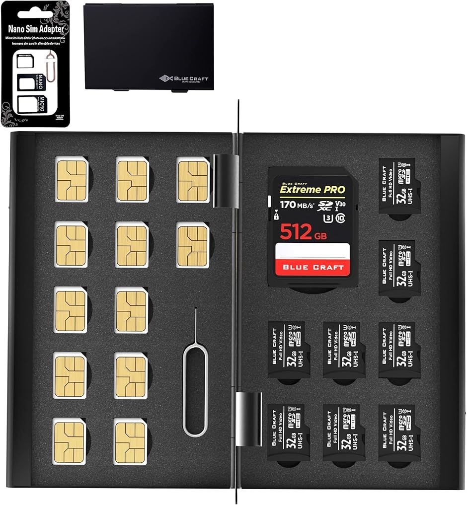 | 商品名 | BLUECRAFT SIM・SDカード 収納ケース アルミ両面タイプ 最大21枚収納 nanoSIM12枚 SD1枚 microSD8枚 SIM変換アダプタ 取出ピン付属 |