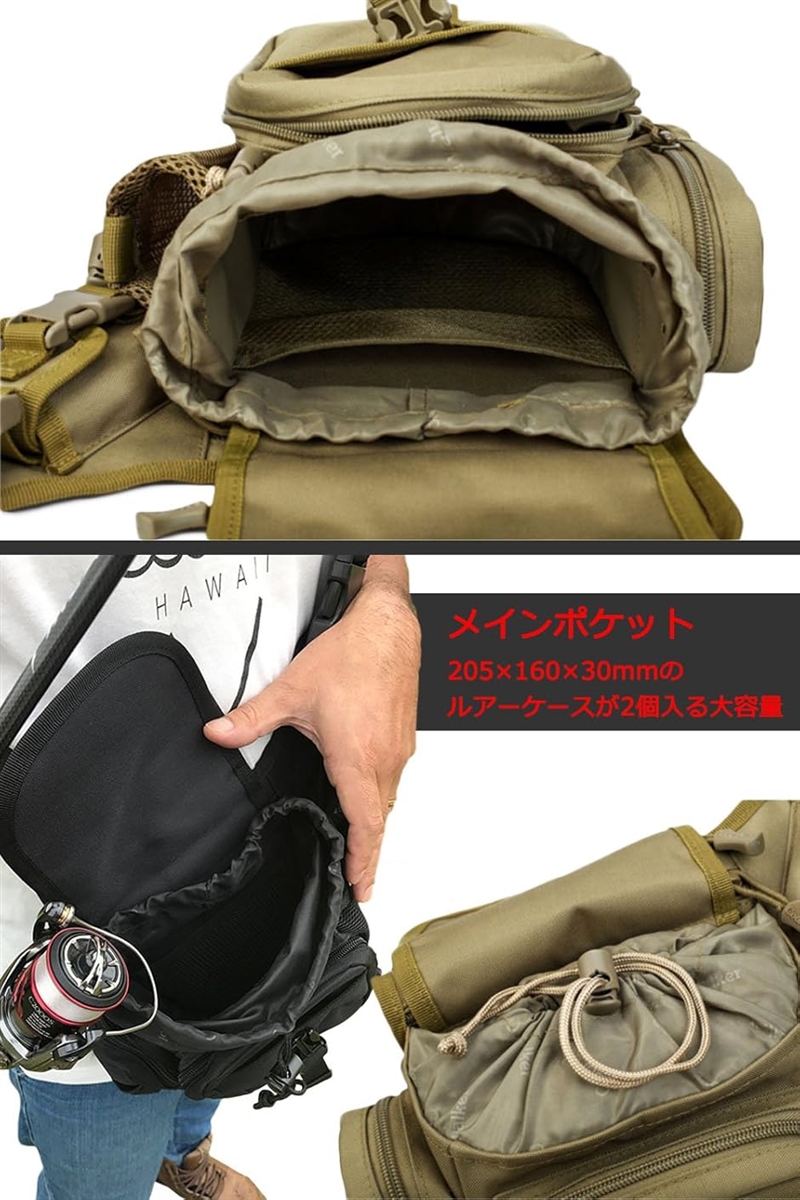 ・メインポケットは205x160x30mmのル アーケースが2個入る大容量