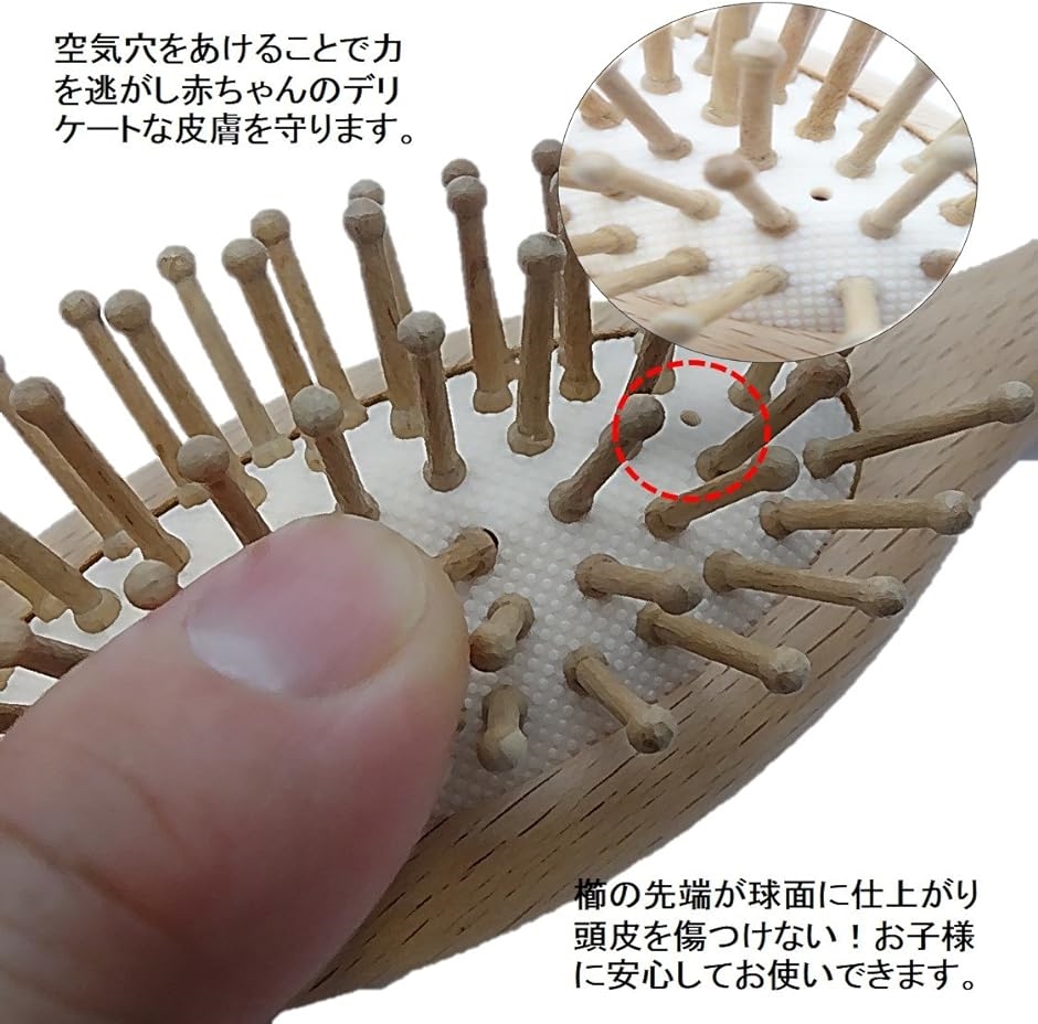 また、天然素材の山羊毛は静電気も起きないため、ふわふわの乳児の整髪にも適し、ブラッシングすることで髪に健康的な艶を与えます。