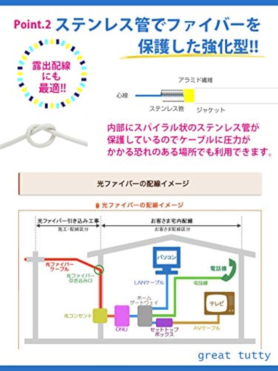 ステンレス管でファイバーを保護した強化型のため、露 出配線に最適。