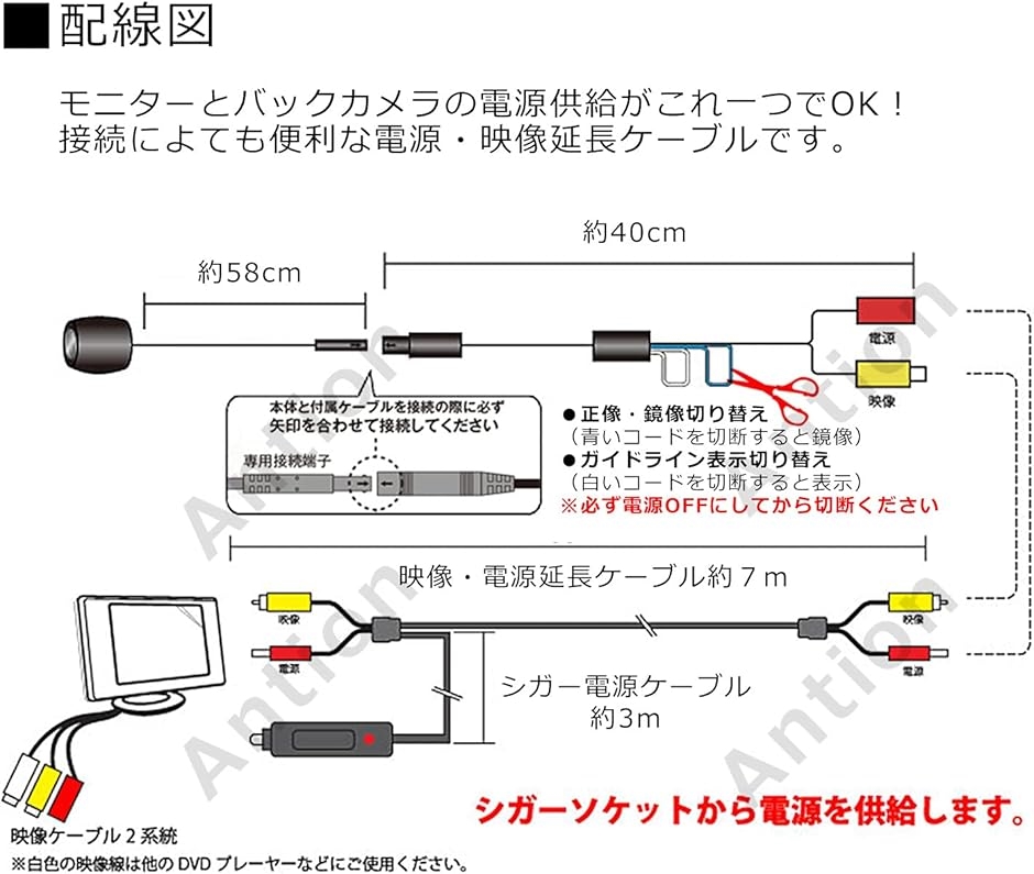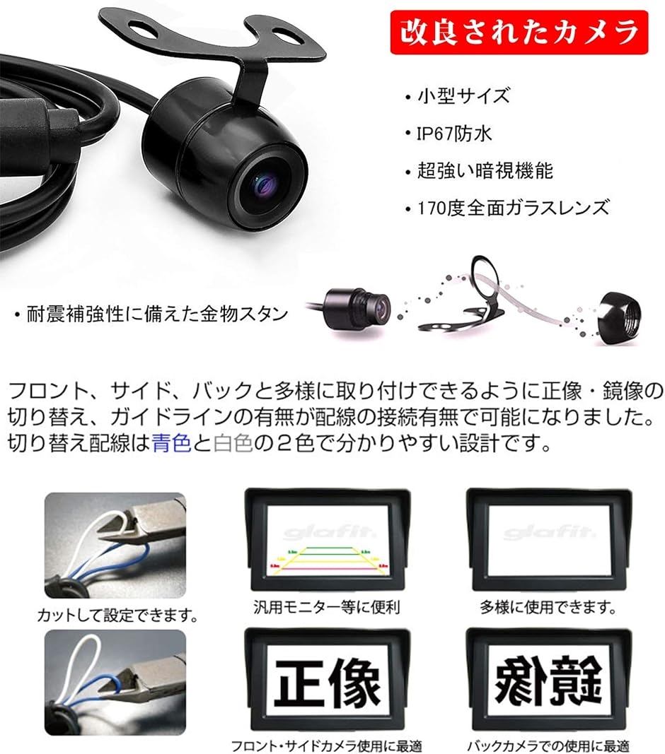 「改良版のバックカメラ」正像・鏡像切替 ガイドライン有・無切替が可能タイプのカメラに改良しました。配線を切断することで、バックカメラ用鏡像やフロントカメラ正像を選択できます。(デフォルト:正像 ガイドライン非表示)吊り下げや上向、横向でも取り付け可能です。