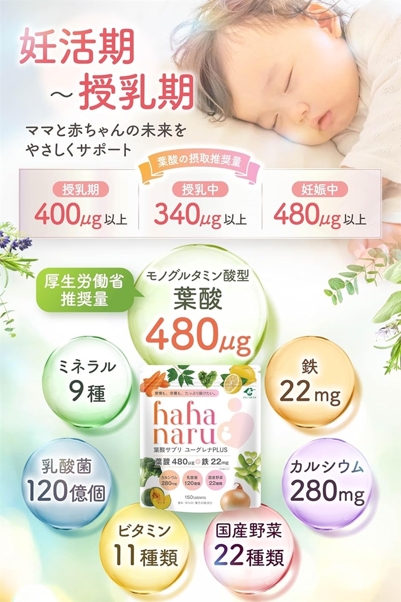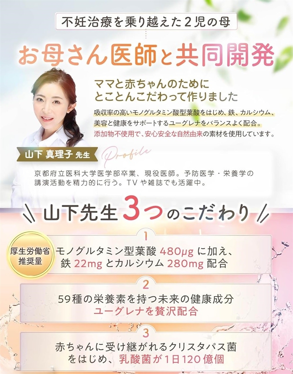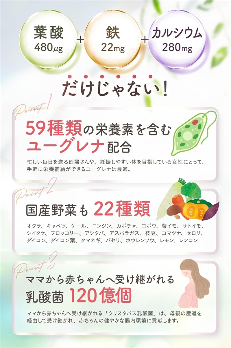 このサプリは、「厚生労働省推奨量」のモノグルタミン酸型葉酸480?をはじめ 鉄22mg ,カルシウム280mg,葉酸の働きをサポートする59種類の栄養素をもつユーグレナ、そして乳酸菌120億と高配合。