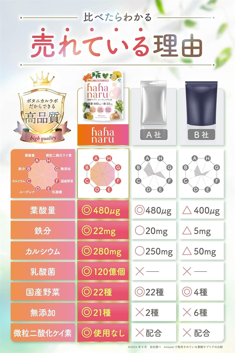 | 商品名 | hahanaru葉酸 480μg 厚生労働省推奨量 鉄 カルシウム 乳酸菌配合 現役医師監修葉酸サプリ |