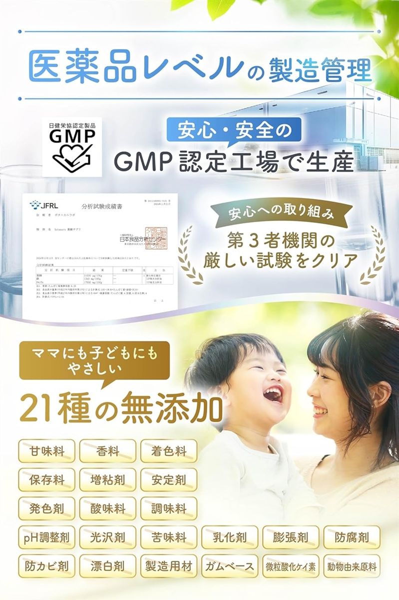 「21種類の無添加」大切な赤ちゃんのために飲むものだから、余計な添加物はもちろん、サプリメントの製造工程で使用される「二酸化ケイ素」など、要らない成分を極限まで省いた安心設計。