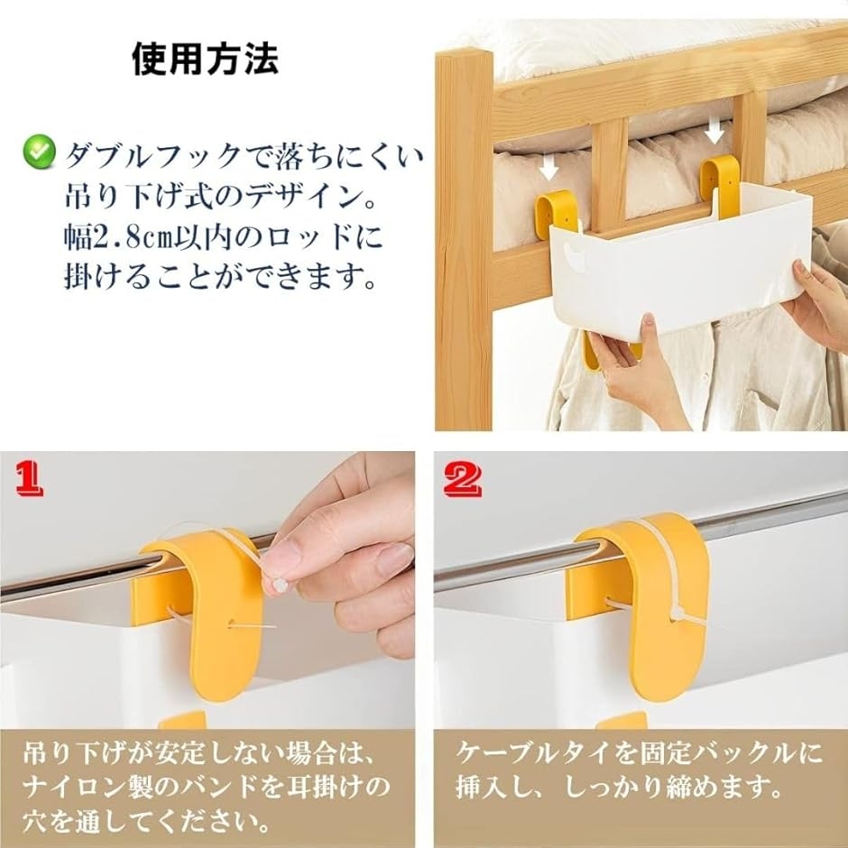 吊り下げる場所が細い場合や不安定な場合はナイロンタイ(結束バンド)でしっかり固定してください。