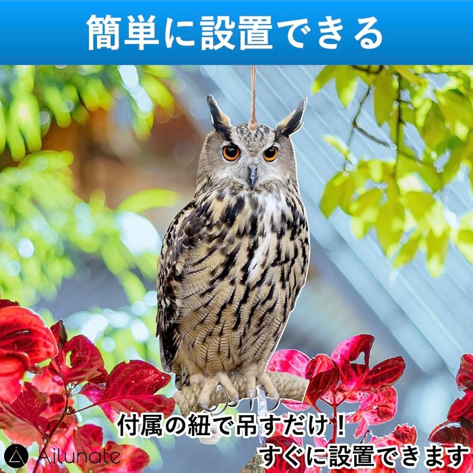 「鳥よけ対策に最適」フクロウが両面にプリントされたプレートを設置することで鳥を威嚇し、鳥が近づくことを防ぎます。