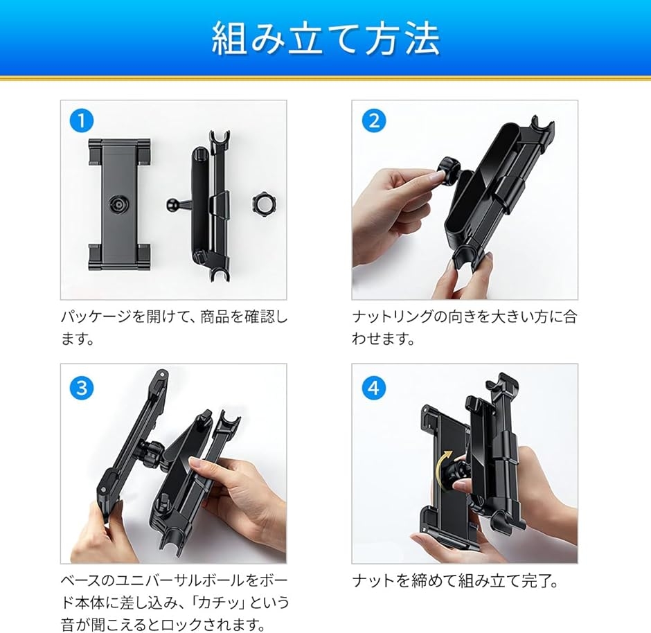 「簡易取付・工具不要」:二点式ヘッドレスト取付ホルダーは車内の運転席および助手席ベッドレストに引っ掛けてわずか3秒だけで本体を装着、固定できます。