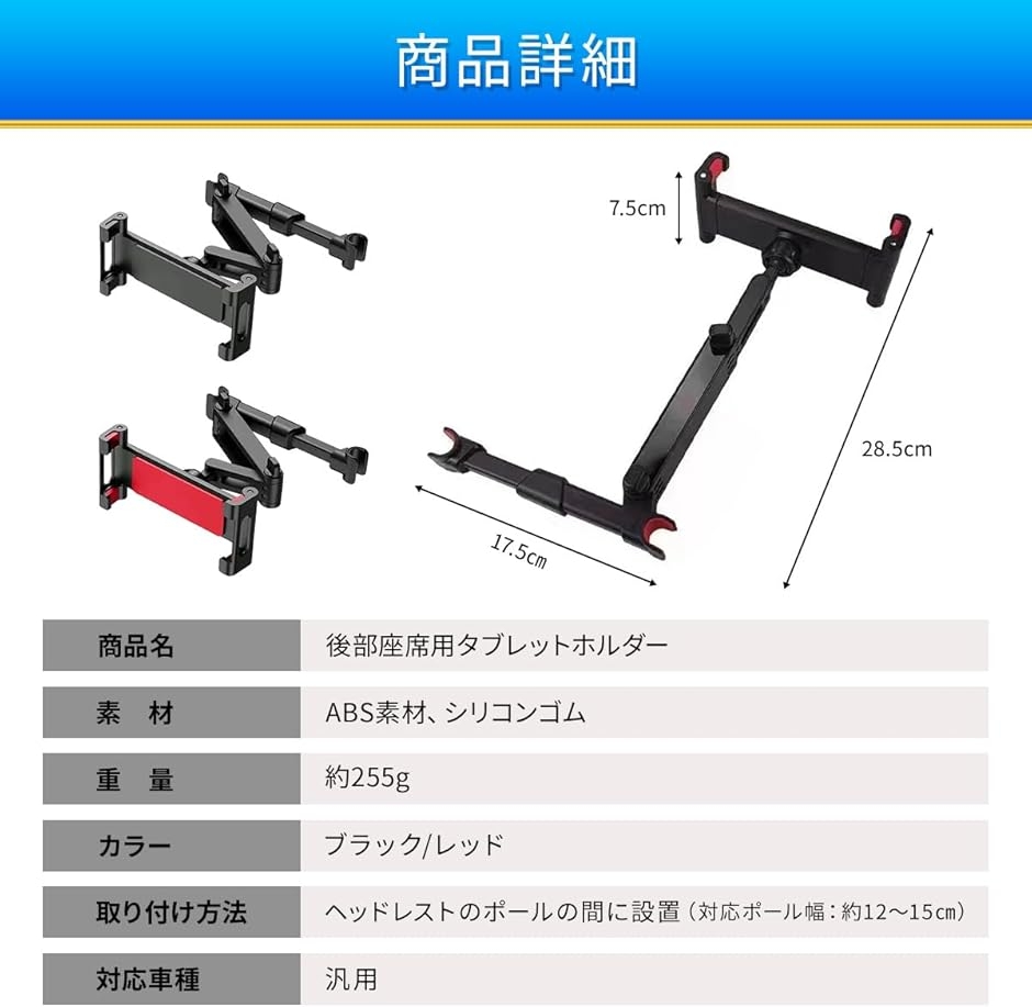 | 商品名 | タブレット ホルダー 車載 後部座席 ヘッドレスト ホルダー 伸縮アーム スマホ ホルダー 汎用 iPad android 赤 |