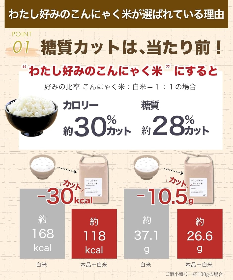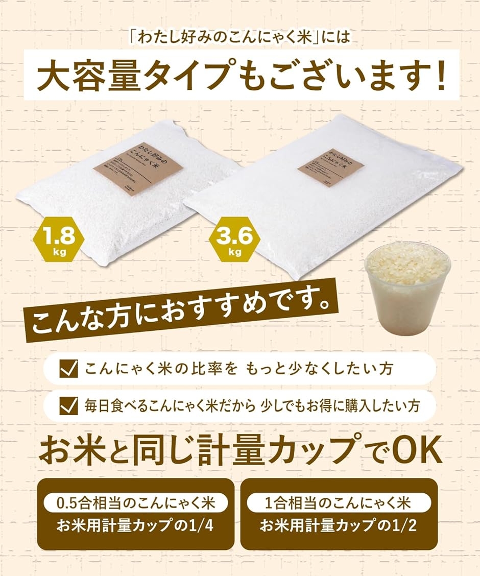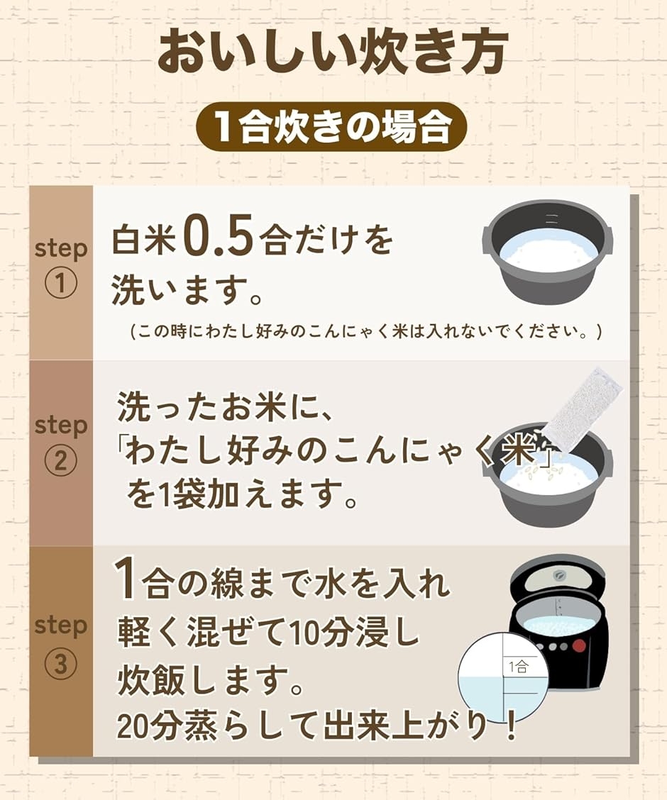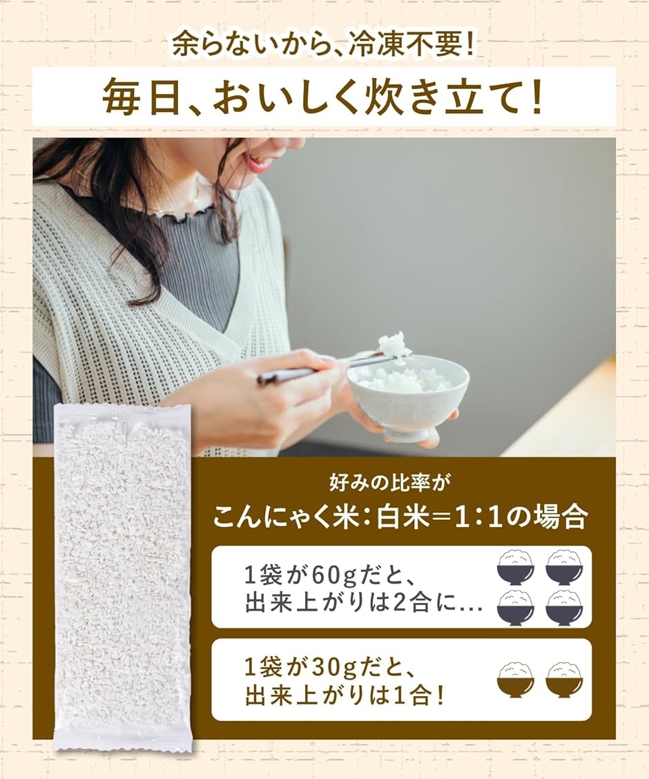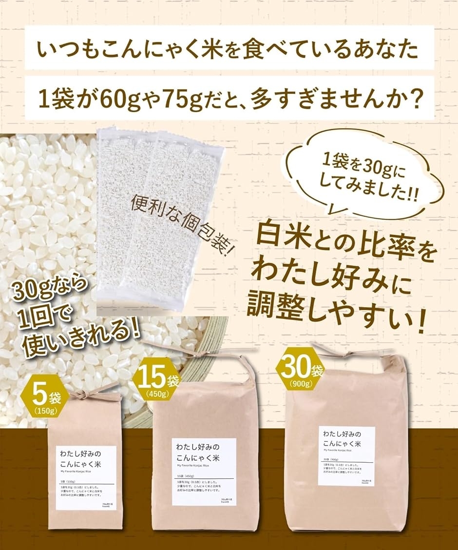 こんにゃく米:白米=1:1の場合、こんにゃく米を30g(お米用計量カップの1/4)にすると、出来上がりは1合です。