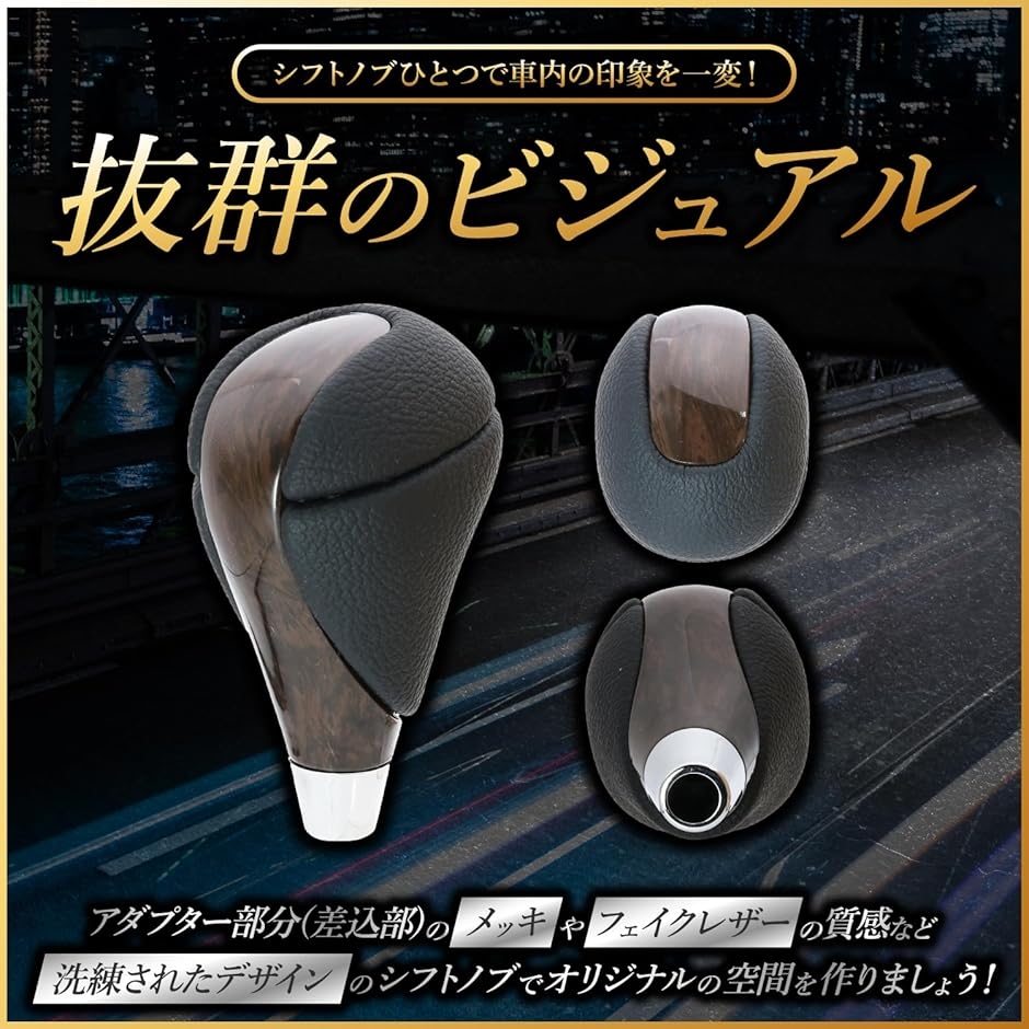 「抜群のビジュアル」シフトノブひとつで車内の印象は一変します。アダプター部分(差込部)のメッキやフェイクレザーの質感など洗練されたデザインのシフトノブでオリジナルの空間を作りましょう。