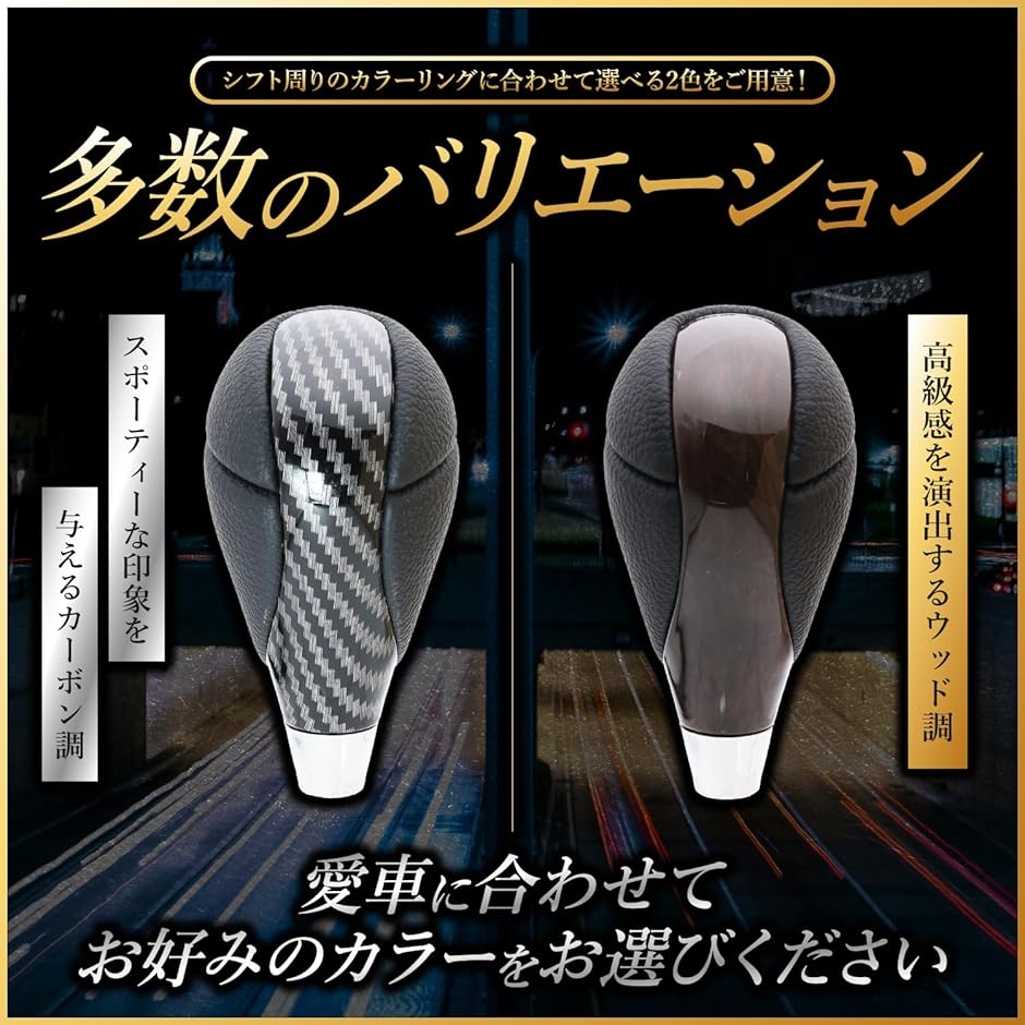 「バリエーション」シフト周りのカラーリングに合わせて選べる2色をご用意。高級感を演出するウッド調。スポーティーな印象を与えるカーボン調。愛車に合わせてお好みのカラーをお選びください。