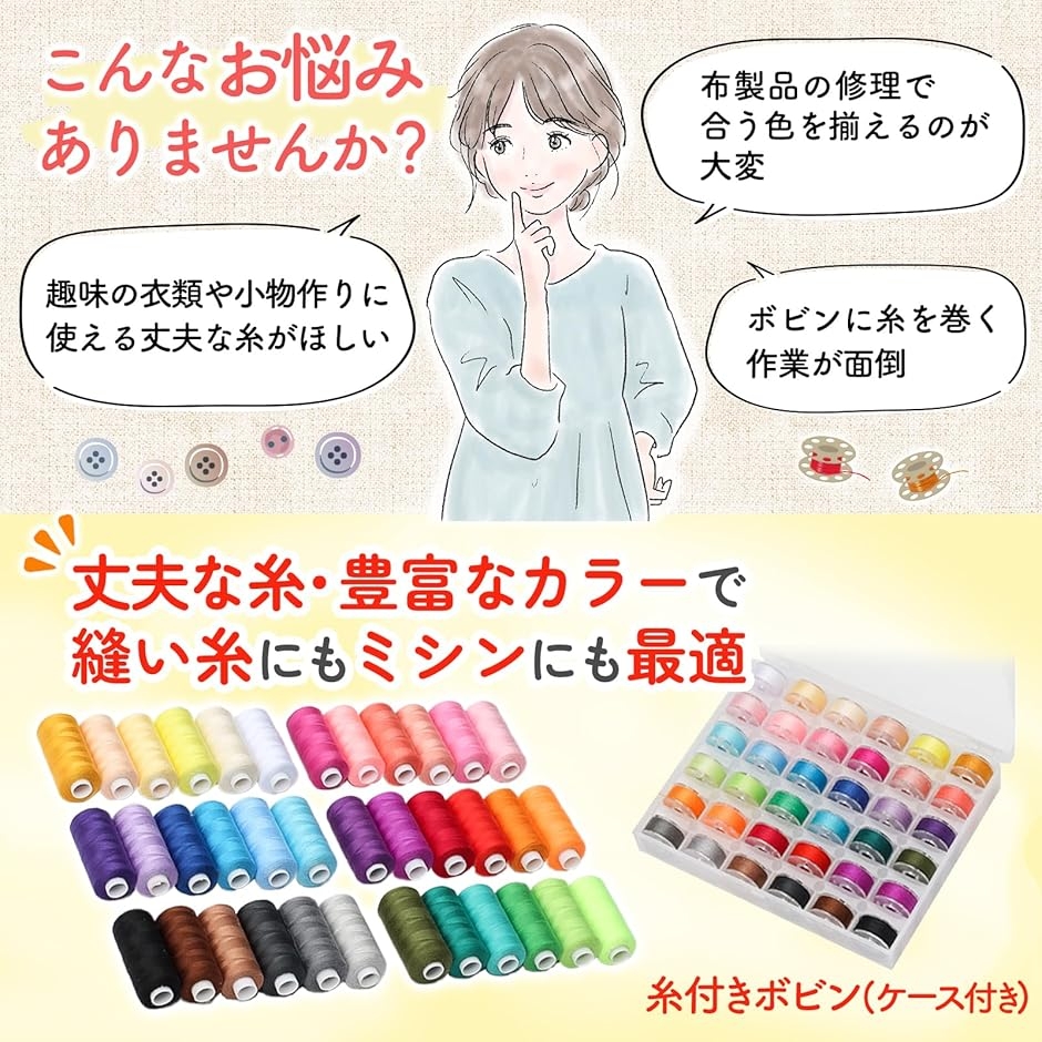 全色収納できる専用ケースと手縫い針12本を同梱し、ボビン高さ11.5?mmでBrother・JUKI・ジャノメなど家庭用ミシンに対応します。